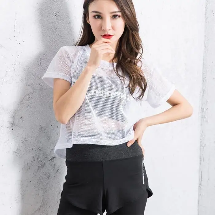 Тип одежды: весенне-летняя женская футболка с коротким рукавом из сетчатого материала для йоги, быстросохнущие спортивные топы для бега