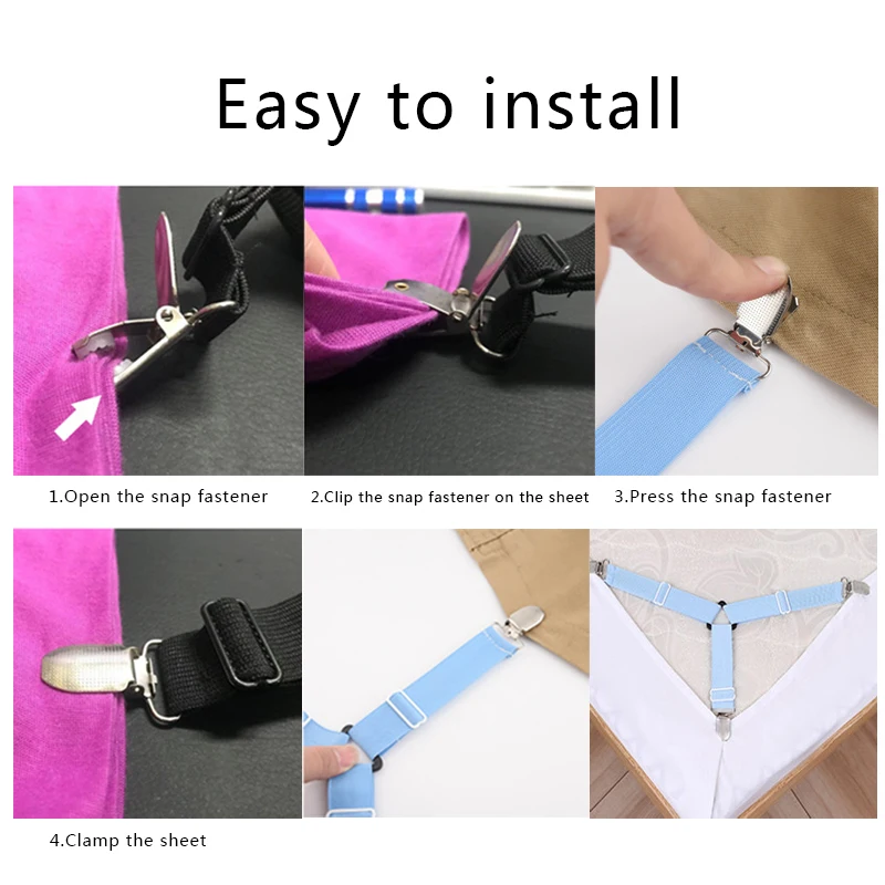 2. Зажимы для утконосов, мягкие с пластиком для твердых и безопасных захватов, эластичные ленты с пряжками для легкой регулировки для различных матрасов и постельного белья размеров.