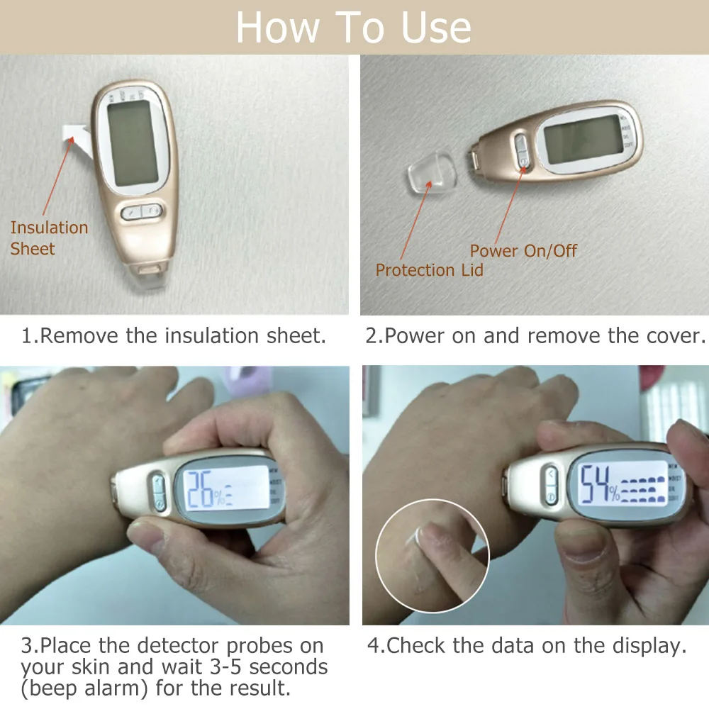 2. Функция памяти может поддерживать последние 5 наборов записей тестирования, удобно сравнивать и знать о состоянии вашей кожи, простое управление кнопками для энергосберегающего опыта работы.