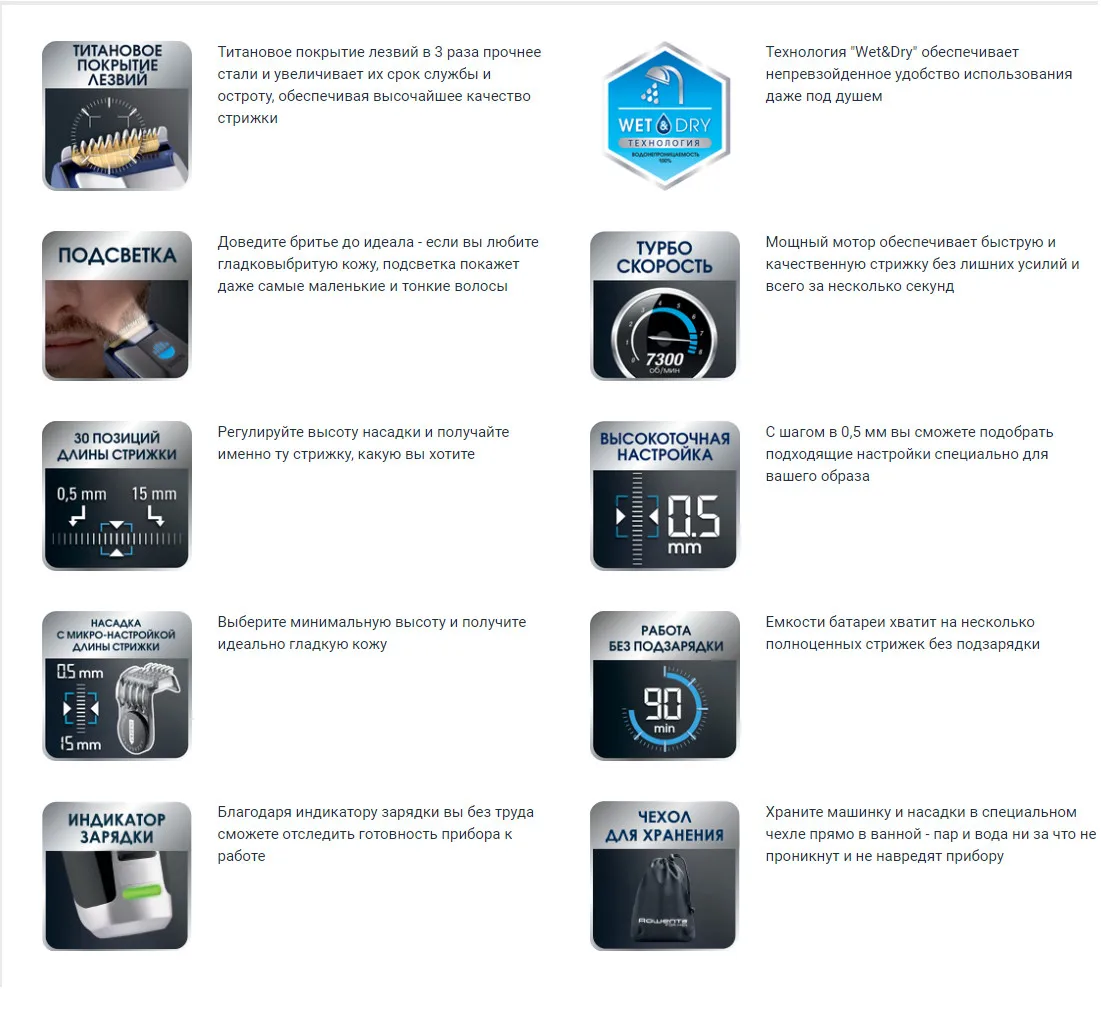 Тип: триммер для бороды Способ бритья: влажный, сухой Можно использовать в воде: да Влажная очистка: есть Питание: автономное Время автономной работы: 60 мин Материал лезвий: титан Ширина лезвия: 32 мм Материал корпуса: пластик Время зарядки аккумулятора: 12 ч Комплектация: устройство для зарядки, насадка направляющая для длины от 0.5 мм до 15 мм, щеточка для чистки, cумка-чехол для хранения Дополнительно: для сухого и влажного бритья, полностью водонепроницаемый, мощный мотор, турбо-режим для густых волос, функция подсветки VISION Производство: Китай Управление Длина стрижки: 0.5 - 15 мм Установка длины стрижки: с помощью регулятора