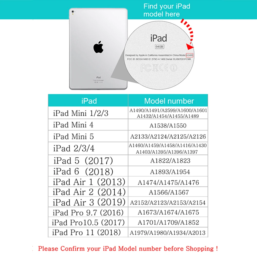 IPad Mini 1/2/3 ----- 7,9 дюйма A1490/A1491/A2599/A1600/A1601/A1432/A1454/A1455/A1489 IPad Mini 4 ----- 7,9 дюйма A1538/A1550 IPad Mini 5 ----- 7,9 дюйма A2133/A2124/A2125/A2126 IPad 2/3/4 ----- 9,7 дюйма A1460/A1459/A1458/A1416/A1430/A1403/A1395/A1396/A1397 IPad 5 (2017) ----- 9,7 дюйма A1822/A1823 IPad 6 (2018) ----- 9,7 дюйма A1893/A1954 IPad 7 (2019) ----- 10,2 дюйма IPad Air 1 (2013) ----- 9,7 дюйма A1474/A1475/A1476 IPad Air 2 (2014) ----- 9,7 дюйма A1566/A1567 IPad Air 3 (2019) ----- 10,5 дюйма A2152/A2123/A2153/A2154 IPad Pro 9,7 (2016) ----- 9,7 дюймов A1673/A1 674/A1675 IPad Pro10.5 (2017) ----- 10,5 дюймов A1701/A1 709/A1852 IPad Pro 11 (2018) ----- 11 дюймов A1987/A80/A1934/A2013 IPad Pro (1-е поколение) 2015 12,9 дюйма IPad Pro (2-е поколение) 2017 12,9 дюйма IPad Pro (3-е поколение) 2018 12,9 дюйма