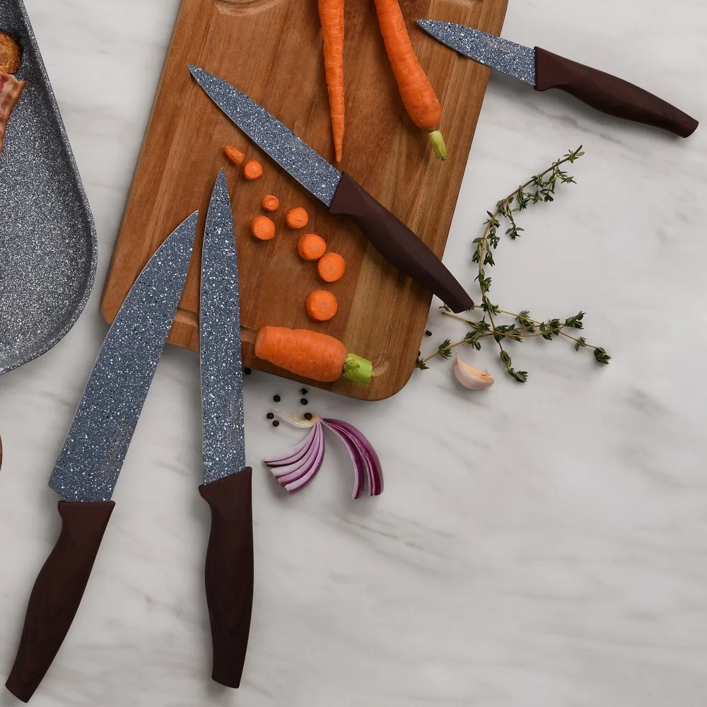 Набор ножейПродолжить с захватывающим набором из 4 кухонных ножей: набор включает в себя: 1 шт. нож шеф-повара 20 см/1 шт. Траншейный нож 20 см/1 шт. многоцелевой нож 12,5 см/1 шт. нож 8,75 см