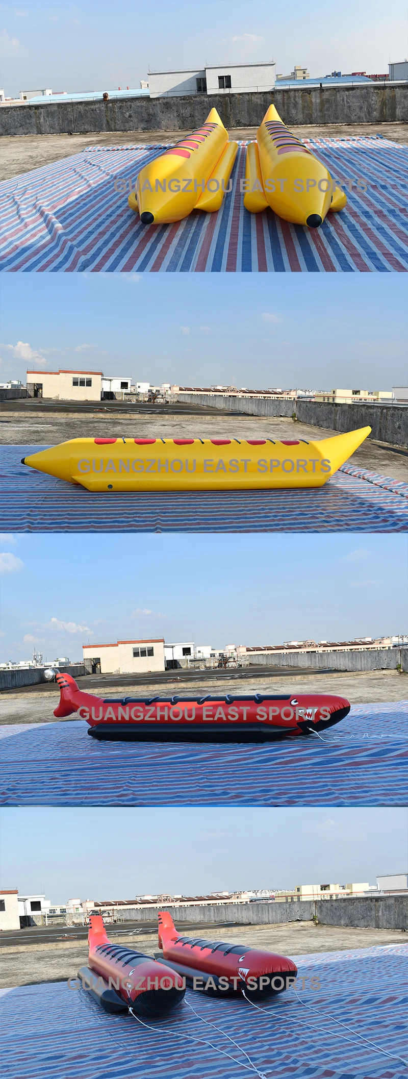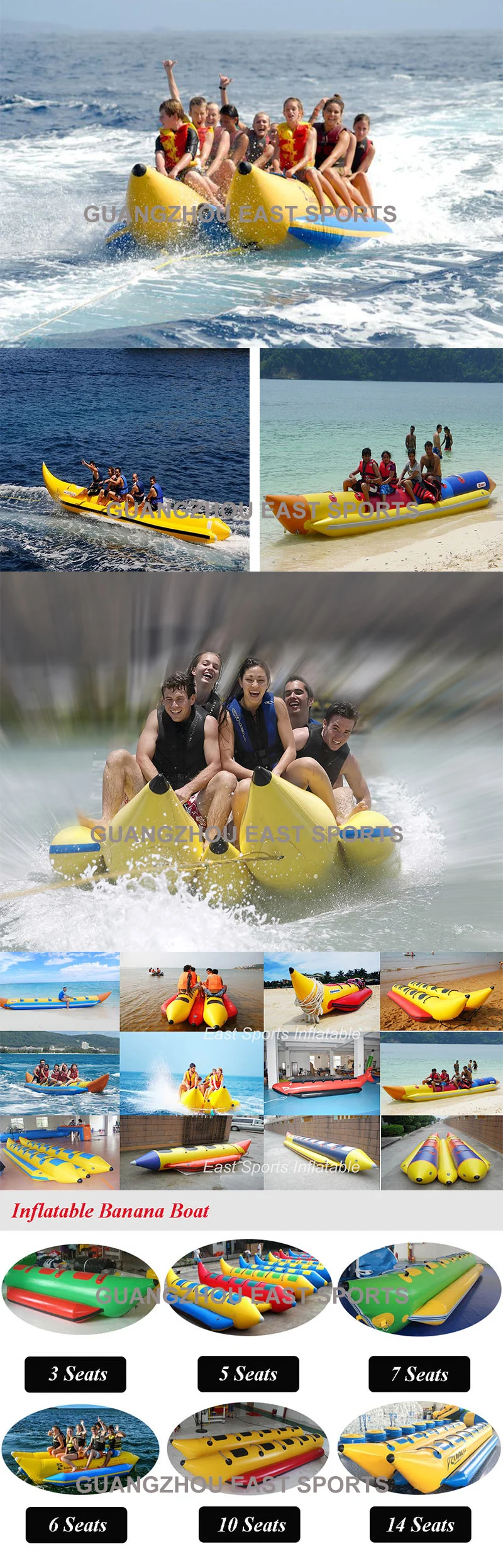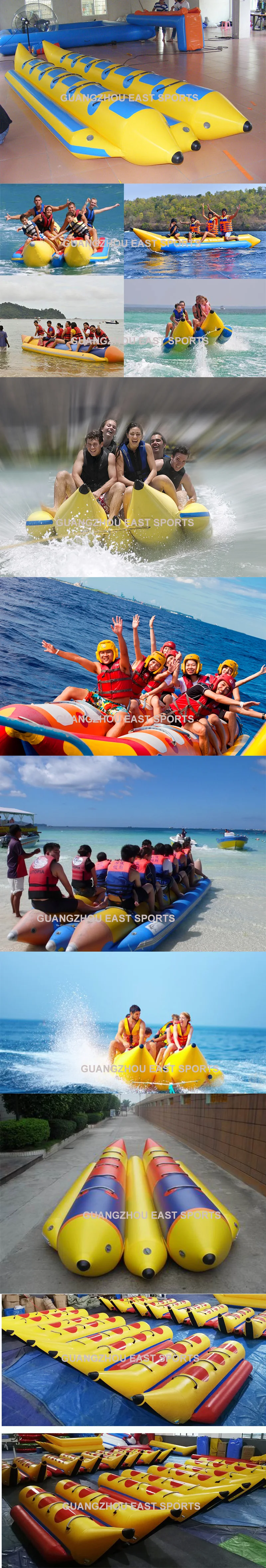 Надувная Банановая лодка в основном является морским местом отдыха на морском мотоцикле, потянув корпус на море, на борту кораблей может быть 3-16 человек, зависит от размера. Этот проект не имеет большого риска, в основном дети любят. Это называется "Банановая" лодка, потому что корпус сам по себе как бананы, так называемый. На самом деле, форма банана на воздушной подушке.