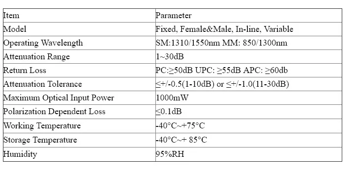 Шаг 1: Тип разъема: FC, SC, LC, ST Шаг 2: Наконечник: PC, UPC, APC Шаг 3: Тип: одномодовый, многомодовый Шаг 4: затухание: 1-10 дБ (шаг 1 дБ), 15, 20, 25, 30 дБ Шаг 5: режим: фиксированный, женский и мужской, встроенный, переменный Шаг 6: Длина волны: 1310 нм, 1550 нм, 850нм, 1300нм