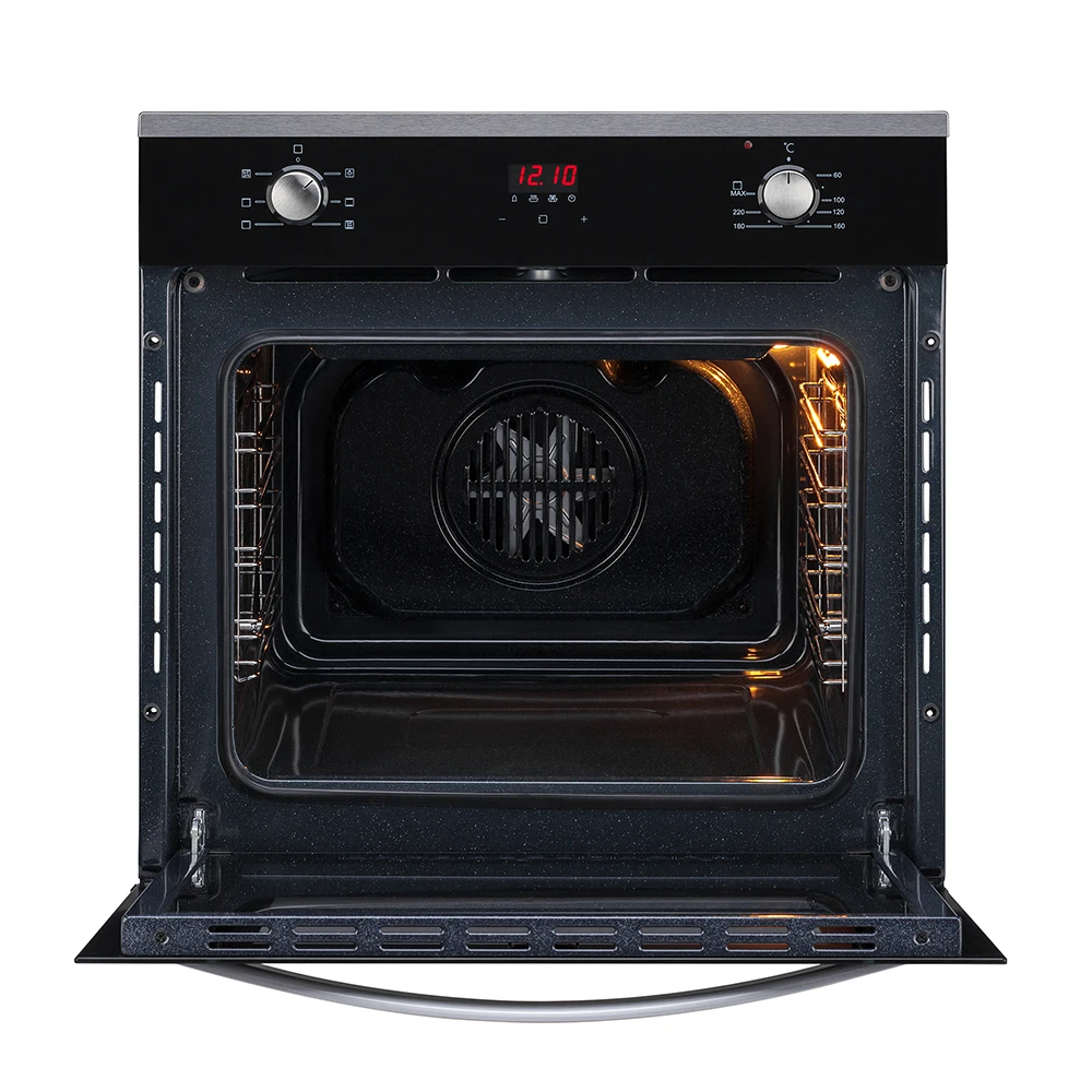Фасад духовки выполнен из черного эмалированного металла, имеющего декоративное обрамление из нержавеющей стали и дополненного утапливаемыми ручками на панели управления. Практичные материалы позволяют легко очистить от загрязнений дверцу и внутреннюю камеру духовки с помощью моющего средства и салфетки из микрофибры.
