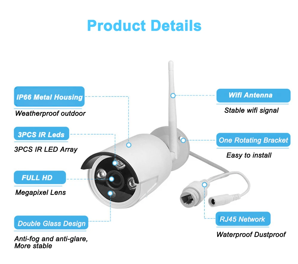 IP66 к атмосферным воздействиям Ip-камеры оцениваются как пыленепроницаемые и водонепроницаемые и покрывают прочным корпусом. Не бойтесь отнестись к снегу, дождю или жаре. Рабочая температура ip-камеры может варьироваться от (от-40 °C до 60 °C)