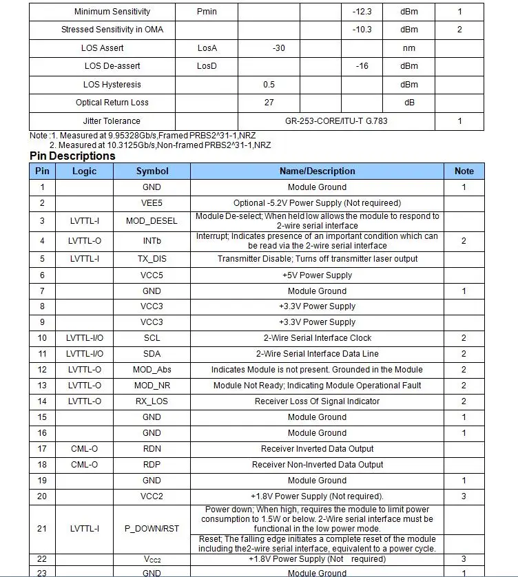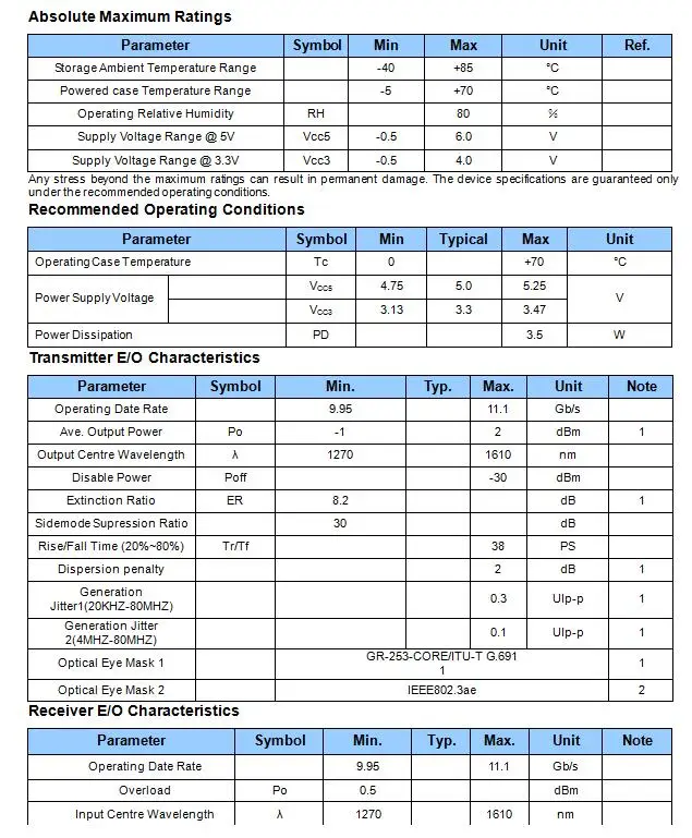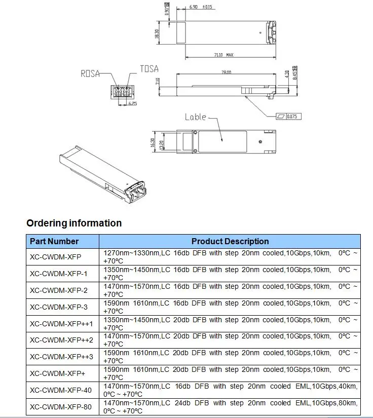Особенности ►Поддерживает приложение 10GBE со скоростью передачи данных 9,953 Гбит/с до 10,3125 Гбит/с ►Максимальная длина соединения 40 км с SMF ► 8-длин волн уплотнителя канала связи с грубым спектральным уплотнением, многоканальной связью передатчик эмл от От 1470нм до 1610нм, с шагом 20нм ►XFP MSA пакет с дуплексным LC разъемом ►XFI высокоскоростной электрический интерфейс ► + 5V + 3,3 V блок питания ►Рассеивание мощности <3,5 Вт ► 2-проводной интерфейс для управления и диагностического монитора ►Compatible с по ограничению на использование опасных материалов в производстве ►Совместимость с IEEE 802.3ae 10 Gigabit Ethernet ►Совместимость с SONET OC-192/SDH STM-64 Приложений ⑤ 10GBASE-ER/EW 10G Ethernet > 1200-SM-LL-L 10G волоконный канал ►Sonet OC-192 IR-2 ►Sdh STM S-64.2b ►Sonet OC-192 IR-3 ►Sdh STM S-64.3b ► ITU-T G.709 Описание продукта: CWDM-XFP трансивер соответствует XFP MSA, и может использоваться для различных применений для SDH/Sonet оборудование, в том числе для детей ТЭК (9,95 ГБ/сек. до 10,7 ГБ/сек.), а также Ethernet LAN (10,325 ГБ/сек.) И WAN (9,95 ГБ/сек.) приложений. Высокая производительность 1270нм до 1610нм с шагом 20 нм длиной волны в центре с охлаждением EML передатчик и высокочувствительный контактный приемник обеспечивают превосходную производительность Для SONET /SDH и Ethernet-приложений на расстоянии до 40 км. Цифровой диагностические функции доступны через 2-проводной последовательный интерфейс, как указано в XFP MSA.