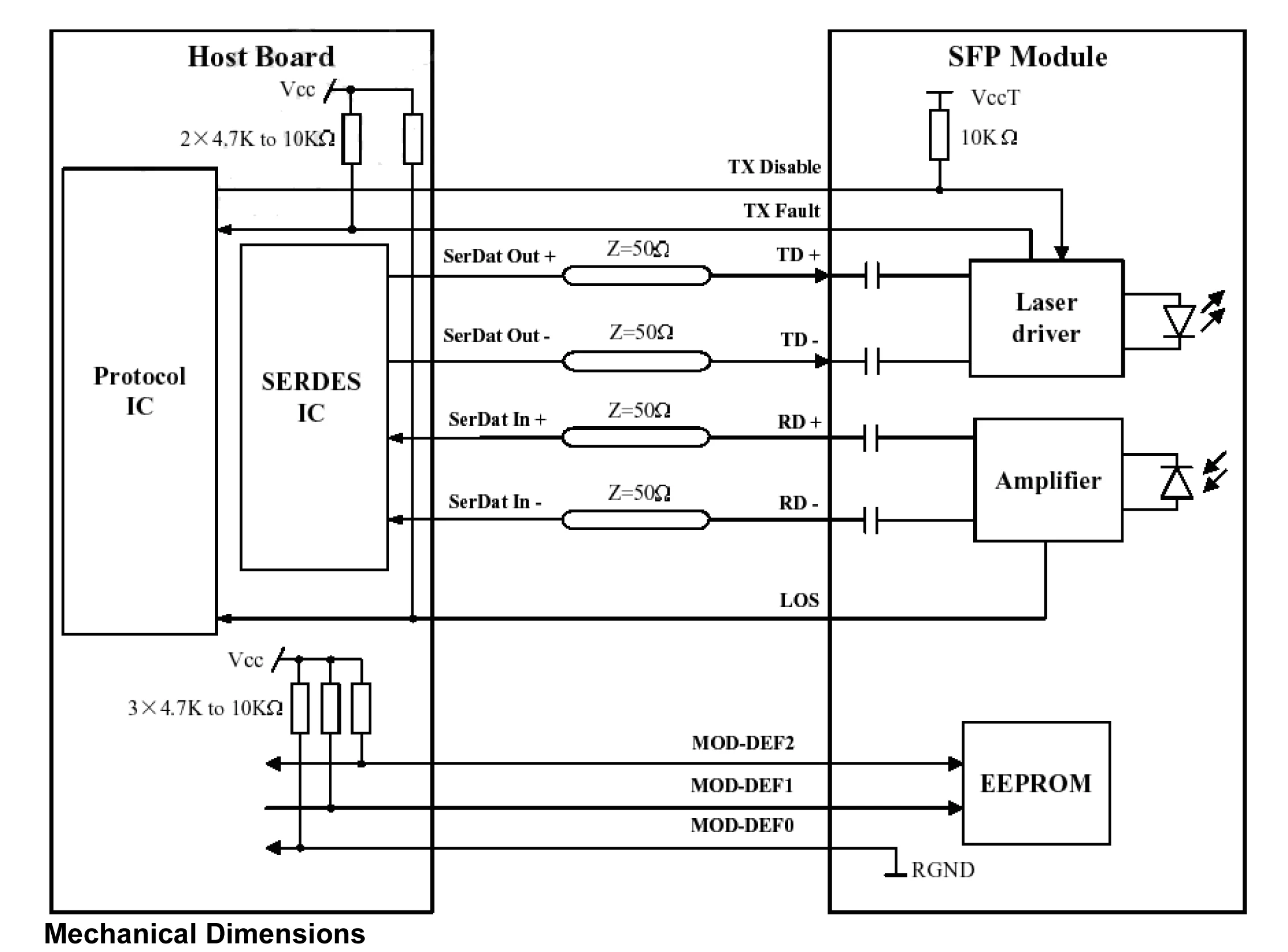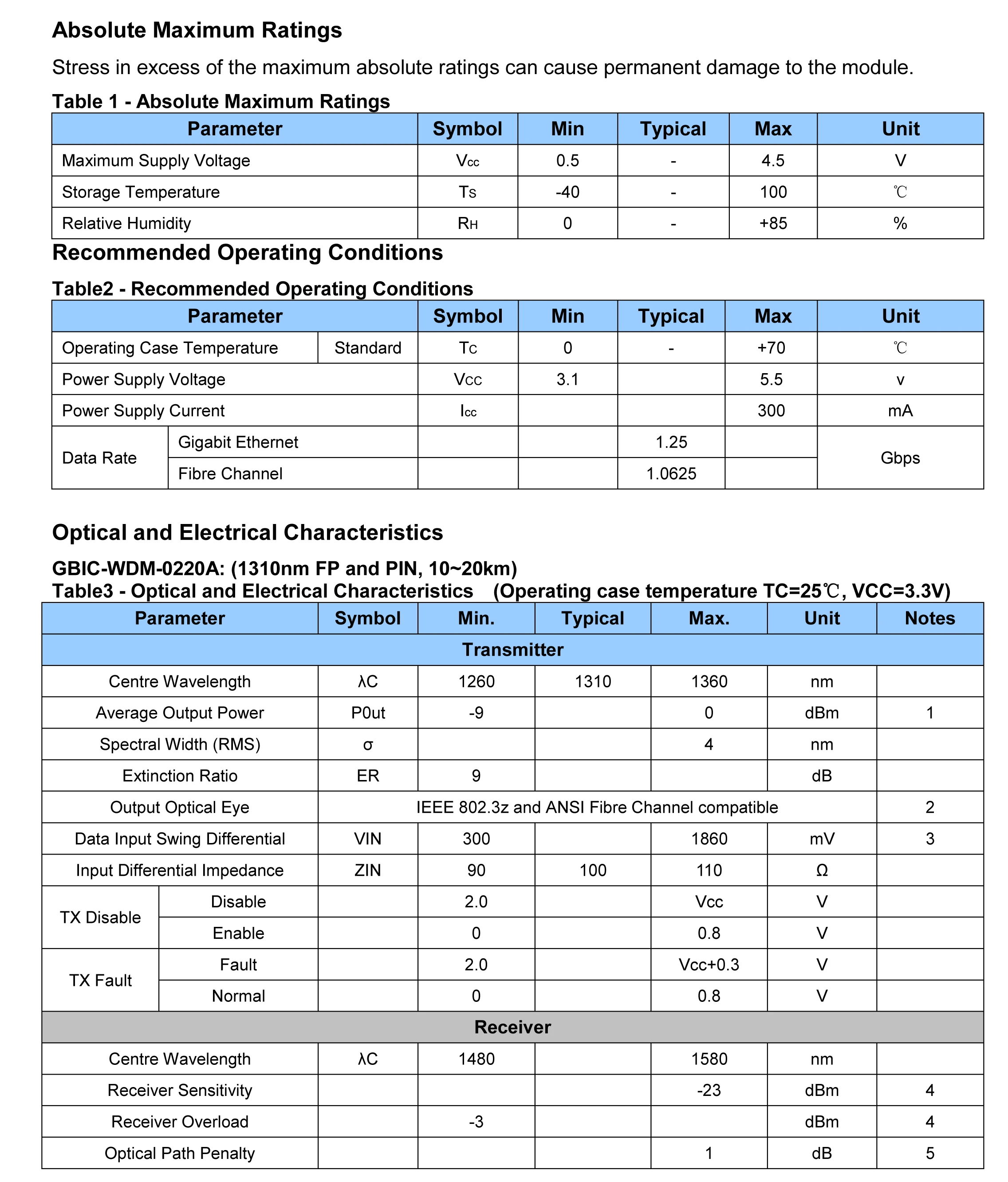 Features ►Dual data-rate of 1.25Gbps/1.0625Gbps operation ►1310nm FP laser and PIN photodetector for 20km transmission ►Duplex SC optical interface ►Standard serial ID information compatible with SFF-8053 ►+3.3V/5Vsingle power supply ►RoHS Compliant ►Operating case temperature: Standard : 0 to +70°C Applications ►Switch to Switch interface ►Switched backplane applications ►Router/Server interface ►Other optical transmission systems Description The GBIC transceiver is high performance, cost effective module supporting dual data-rate of 1.25Gbps/1.0625Gbps and from 20km transmission distance with SMF. The transceiver consists of two sections: The transmitter section incorporates a FP laser. And the receiver section consists of a PIN photodiode integrated with a trans-impedance preamplifier (TIA). All odules satisfy class I laser safety requirements. The optical output can be disabled by a TTL logic high-level input of Tx Disable. Tx Fault is provided to indicate degradation of the laser. Loss of signal (LOS) output is provided to indicate the loss of an input optical signal of receiver. The standard serial ID information Compatible with GBIC MSA describes the transceiver’s capabilities, standard interfaces, manufacturer and other information. The host equipment can access this information via the two-wire serial CMOS EEPROM protocol. For further information, please refer to SFF-8053