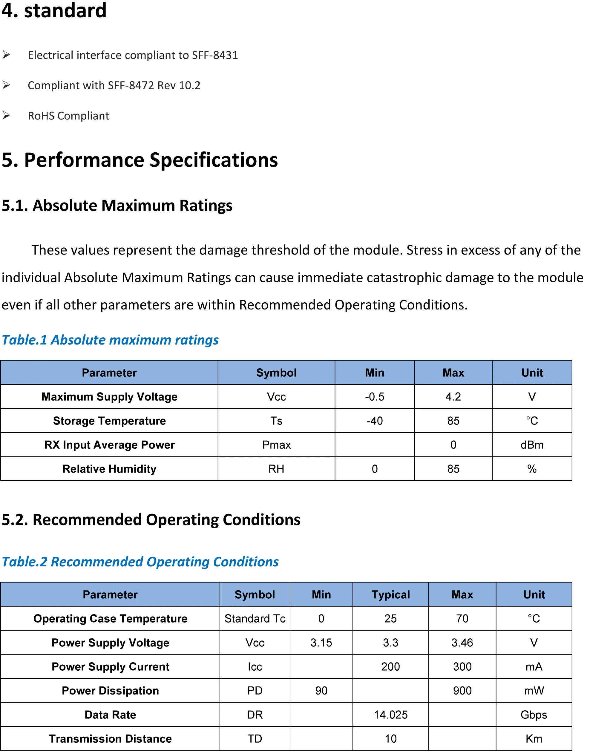 Продукт Особенности Настройте до 14,025 ГБ/сек. двунаправленный канал передачи данных Популярная модель SFP + Встроенные цифровые диагностические функции Лазерный Передатчик DFB 1310 нм Дуплекс LC коннектор Сертификация RoHS совместима и не содержит свинца Выдерживает до 10 км на 9/125 ватт м SMF Металлическое ограждение для нижних EMI Увеличьте 1 Вт максимальное энергопотребление с установленными звеньями Один 3,3 V источника питания Диапазон рабочих температур: от 0 °C до 70 °C Приложений √ Три скорости 4,25/8,5/14,025 ГБ/сек. Fibre Channel через тариф для выбора √ 10GBASE-LR/LW 10G Ethernet 1. Описание продукта Приемопередатчики SFP + SFP16GLR предназначены для использования в соединениях Fibre Channel до 14,025 ГБ/сек. скорости передачи данных и до 10 км длины связи. Они совместимы с FC-PI-5 Rev. 6,101 и SFF-8472 Rev 11,03 и совместимы с SFF-84322 и применимыми частями SFF-8431 Rev. 3,04. Оптические приемопередатчики соответствуют директиве RoHS 2011/65/EU. 2. Соответствие нормативам Приемопередатчики-это лазерные продукты класса 1, соответствующие требованиям FDA. Соответствие требованиям безопасности глаз класса 1 EN 60825 и требованиям электрической безопасности EN 60950.
