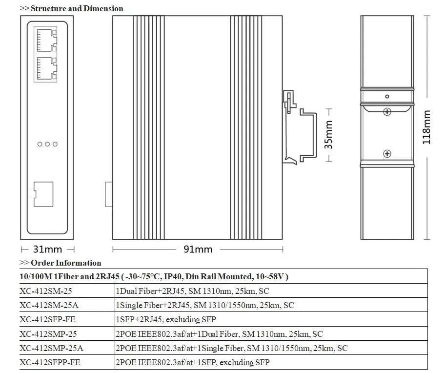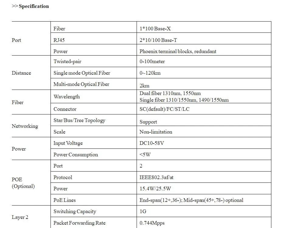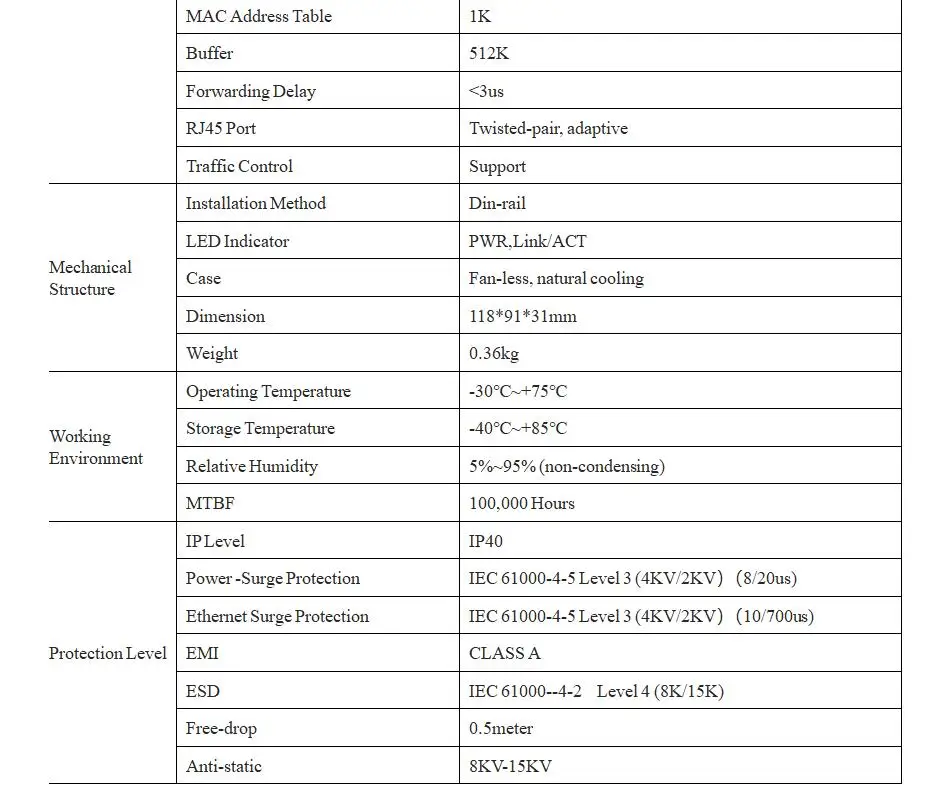 Входное напряжение: 10 ~ 58 В постоянного тока (резервное) Рабочая температура: -30 ℃ ~ + 75 ℃ Чехол: защита IP40, конструкция без вентилятора Антистатический уровень: 8кв-15кв MTBF: 100000 часов > Описание Коммутатор Ethernet использует архитектуру store-forward, безвентиляторную и энергосберегающую конструкцию. Конструкция соответствует стандарту Ethernet с молнией и антистатической защитой. Они применимы к широкому диапазону рабочей температуры от-30 °C до + 75 °C с стабильной и надежной производительностью. Они могут широко применяться в различных областях широкополосной передачи данных, таких как интеллектуальная транспортировка, телекоммуникации, безопасность, финансовые ценные бумаги, таможня, транспортировка, энергетика, водоснабжение и нефтяные месторождения.