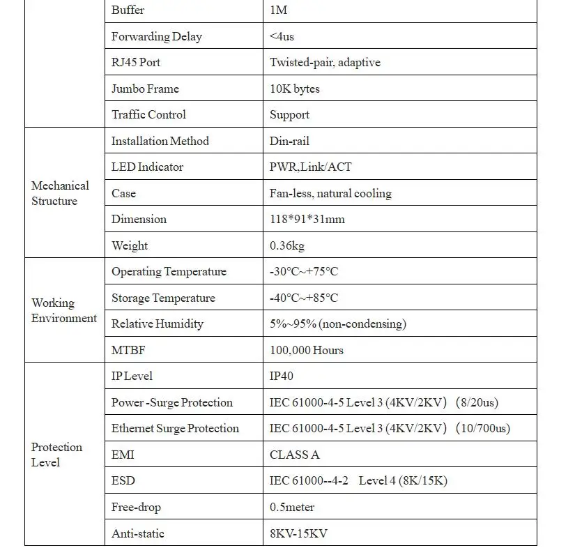 Входное напряжение: DC10 ~ 58 в (избыточное) Рабочая температура:-30 ℃ ~ + 75 ℃ Корпус: защита IP40, конструкция без вентилятора Антистатический уровень: 8KV-15KV MTBF: 100000 часов > Описание Коммутатор Ethernet использует передовую архитектуру, безвентиляторную и энергосберегающую конструкцию. Дизайн соответствует стандарту Ethernet с молниеносной и антистатической защитой. Они применяются к широкому диапазону рабочих температур от-30 °C до + 75 °C с стабильной и надежной производительностью. они могут широко применяться в различных областях широкополосной передачи данных, таких как интеллектуальная транспортировка, телекоммуникации, безопасность, финансовые ценные бумаги, таможня, доставка, энергия, водное сохранение и нефтяные месторождения.