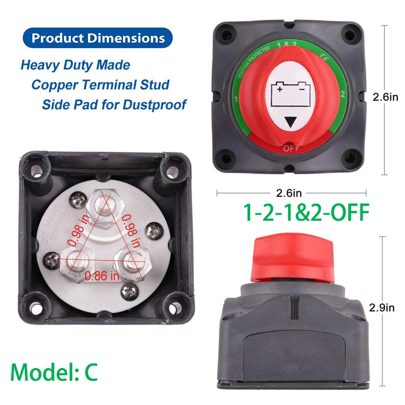 Модель C/D:1-2-оба-выключены, 4 положения, 200 A непрерывный на 12 В постоянного тока, 300 A непрерывный на 12 В постоянного тока, 1000 A мгновенный на 12 В постоянного тока.