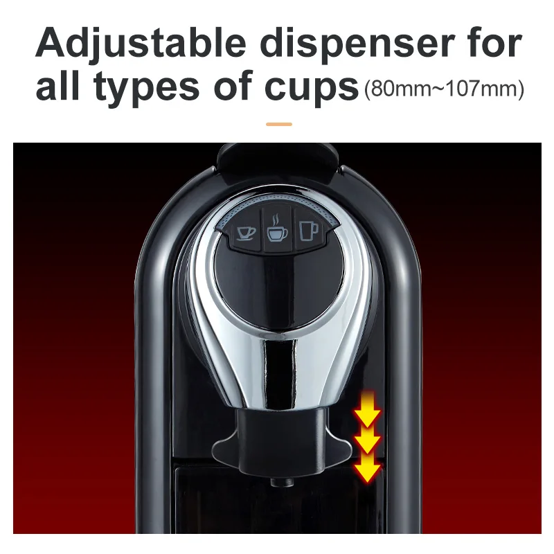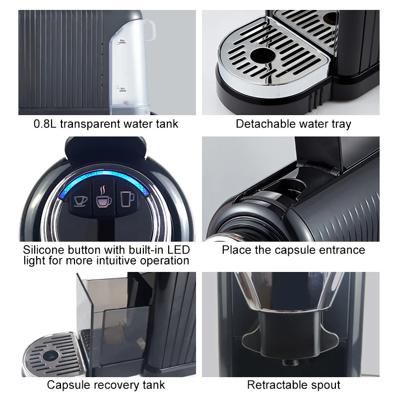 1. Мощность: 1260 Вт, термоблочный нагреватель. 2. Емкость воды: 0.8л, 3. Съемный резервуар для воды с легкой крышкой. 4. Италия 19 бар насос, Швейцария расходомер. 5. Переключатель ВКЛ/ВЫКЛ. 6. Кнопки для коротких, средних и длинных эспрессо, 7. Сверхвысокая температура опционально 9. Регулируемый диспенсер для различных чашек (80 мм ~ 107 мм) 10. Капсульный контейнер с Максимальное количество использованных капсул. 11. Будильник, когда резервуар для воды пуст. 12. Прерывание пивоварения при открытии ручки во время пивоварения. 13. Система автоматического выброса капсул. 14. Программируемый объем кофе. 15. Запатентованная Пивоваренная группа и система ischarge остаточного давления 16. Компактный размер: 118 (Ш) * 365 (Д) * 250 (В) 17. Подождите 15 минут. 18. Одобрено ETL/ GS, ErP2, RoHS, LFGB соответствие
