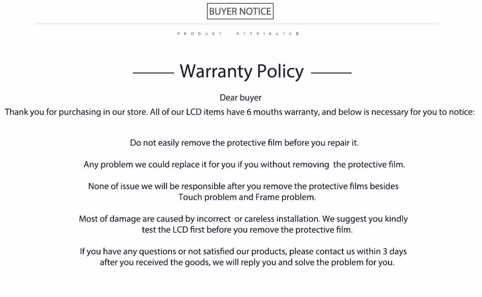 1. 100% абсолютно новый и никогда не использовал ЖК-дисплей в сборе. 2. Он используется для ремонта, замены неправильного, поврежденного, треснутого, notrecognised LCD, сенсорного экрана 3. Поставляется с pretective пластиковой пленкой на экранах и безопасной упаковкой 4. Большое количество в наличии 5. Протестировано перед отправкой и 100% работает хорошо 6. Доставка в течение 1-2 рабочих дней после подтверждения оплаты 7. Отличное послепродажное обслуживание Если Вы не нашли нужный вам экран LCDs в нашем магазине, пожалуйста, свяжитесь с нами, и мы постараемся вам помочь. Пожалуйста, обратите внимание на следующие 2 пункта, это очень импорт для покупателей. 1. Дорогой друг, пожалуйста, проверьте его перед установкой ЖК-дисплея. Это очень важно для гарантии. Как мы знаем, ЖК-дисплей легко иметь проблемы, когда у ЖК есть проблемы, прежде чем установить его, мы можем заменить Товар по вашему заказу. Если у вас есть проблемы с ЖК-дисплеем после его установки и вы не тестировали его перед установкой, тогда мы не можем предоставить гарантию по причинам человеческого характера и отклонить такой спор, спасибо! 2. Дорогой друг, мы предлагаем вам купить "Сборку с рамкой", потому что сборка с рамкой легко изменить. Если вы покупаете сборку без рамки, вы будете делать больше вещей, чтобы изменить экран. Если вы профессионалы, чтобы изменить экран, вы можете купить сборку без рамки. Это наш совет. Мы профессиональные оптовики. Если вам нужно большое количество заказов, пожалуйста, свяжитесь с нами. Мы можем дать вам скидку!