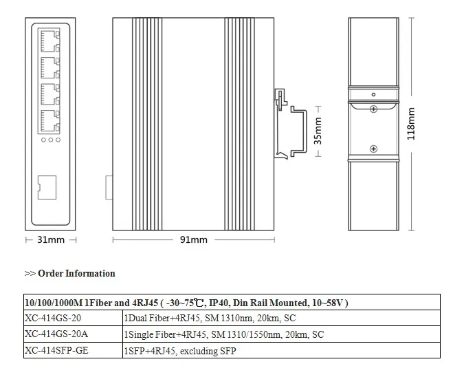 Входное напряжение: DC10 ~ 58 в (избыточное) Рабочая температура: -30 ℃ ~ + 75 ℃ Чехол: защита IP40, дизайн без вентилятора Антистатический уровень: 8KV-15KV Средняя наработка на отказ: 100000 часов > Описание Коммутатор Ethernet использует передовую архитектуру, безвентиляторную и энергосберегающую конструкцию. Дизайн соответствует стандарту Ethernet с молниеносной и антистатической защитой. Они применяются к широкому диапазону рабочих температур от-30 °C до + 75 °C с стабильной и надежной производительностью. Они могут широко применяться в различных областях широкополосной передачи данных, таких как интеллектуальная транспортировка, телекоммуникации, безопасность, финансовые ценные бумаги, таможня, доставка, энергия, водное сохранение и нефтяные месторождения.