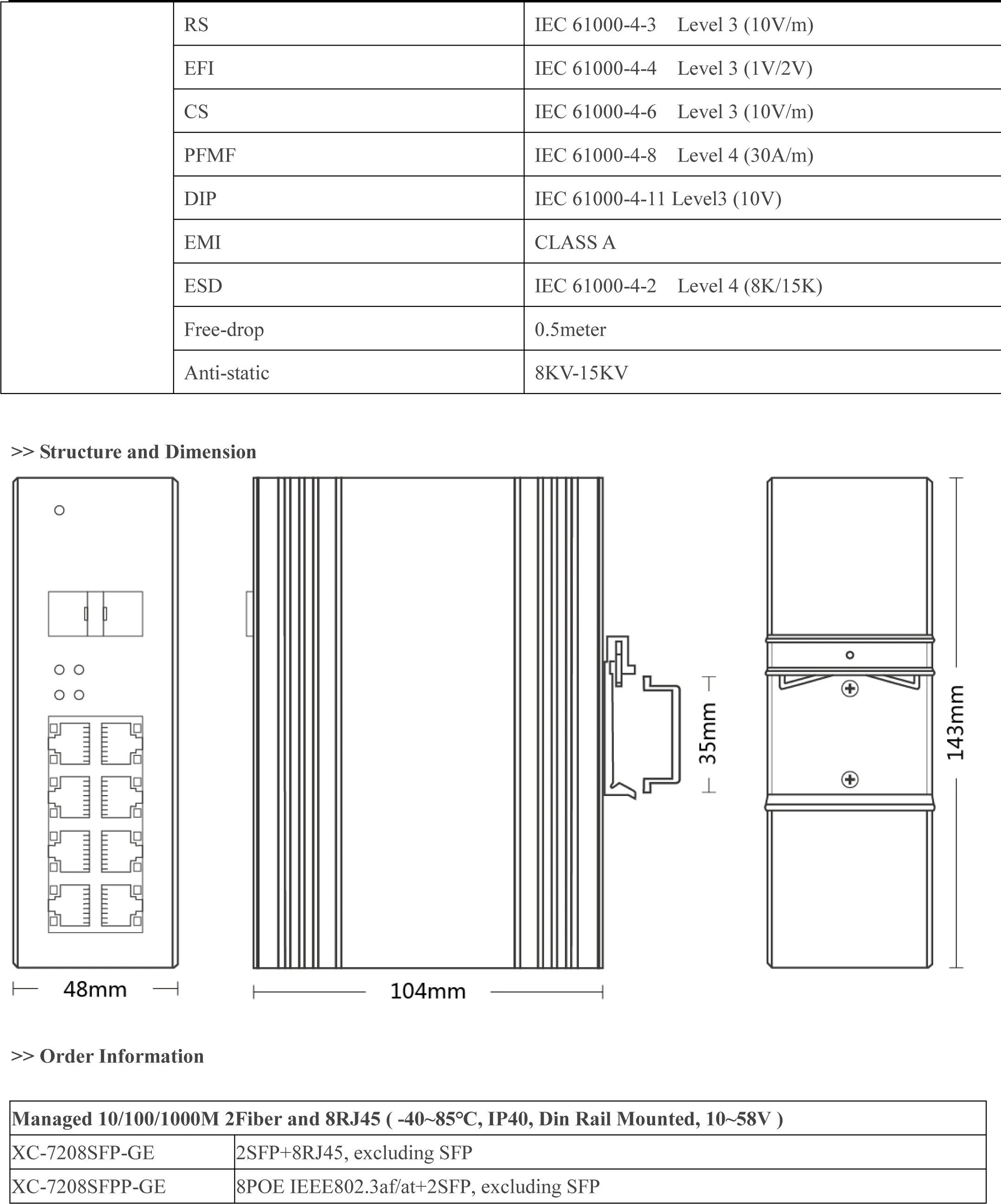 Input Voltage: DC10~58V (Redundant) Operating Temperature: -40℃ ~ +85℃ Case: IP40 protection, fan-less design Anti-static level: 8KV-15KV MTBF: 100000 Hours >> Description The Ethernet switch uses store-forward architecture,fan-less and energy-saving design.The design complies with the Ethernet standard with lightning and anti-static protection. They apply to the wide range of operating temperature from -40°C to +85°C with stable and reliable performance.They can be widely applied to various broadband data transmission fields, such as intelligent transportation, Telecommunications, security, financial securities, customs, shipping, power, water conservancy and oil fields.