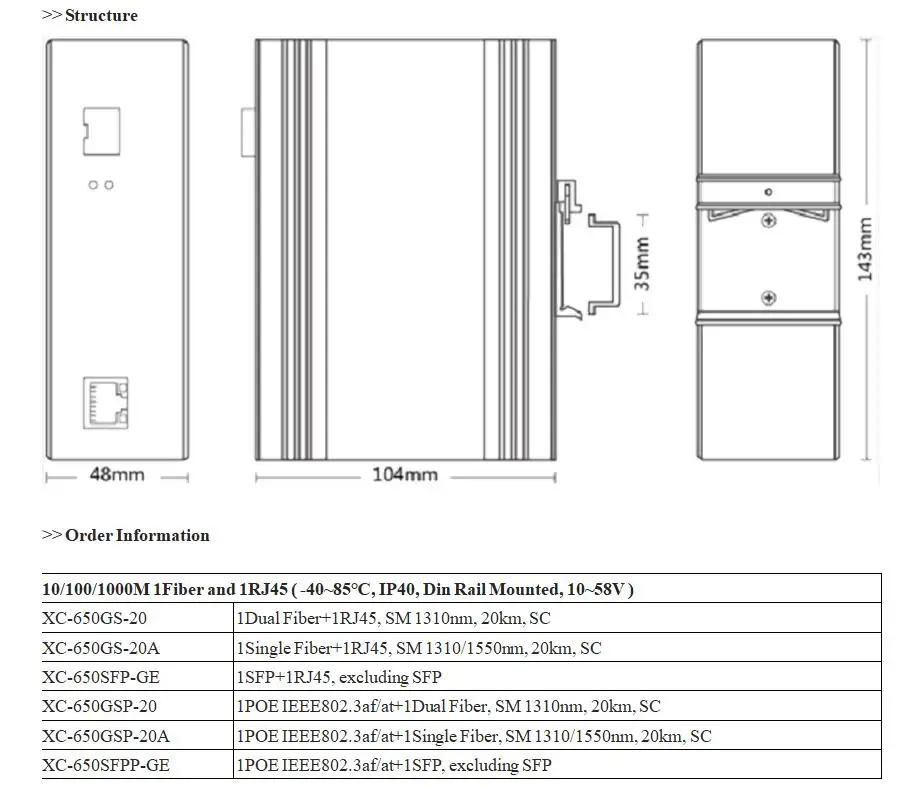 10/100/1000 м 1 волокно и 1RJ45 ( -40 ~ 85 ℃, IP40, din-рейка, 10 ~ 58 в)