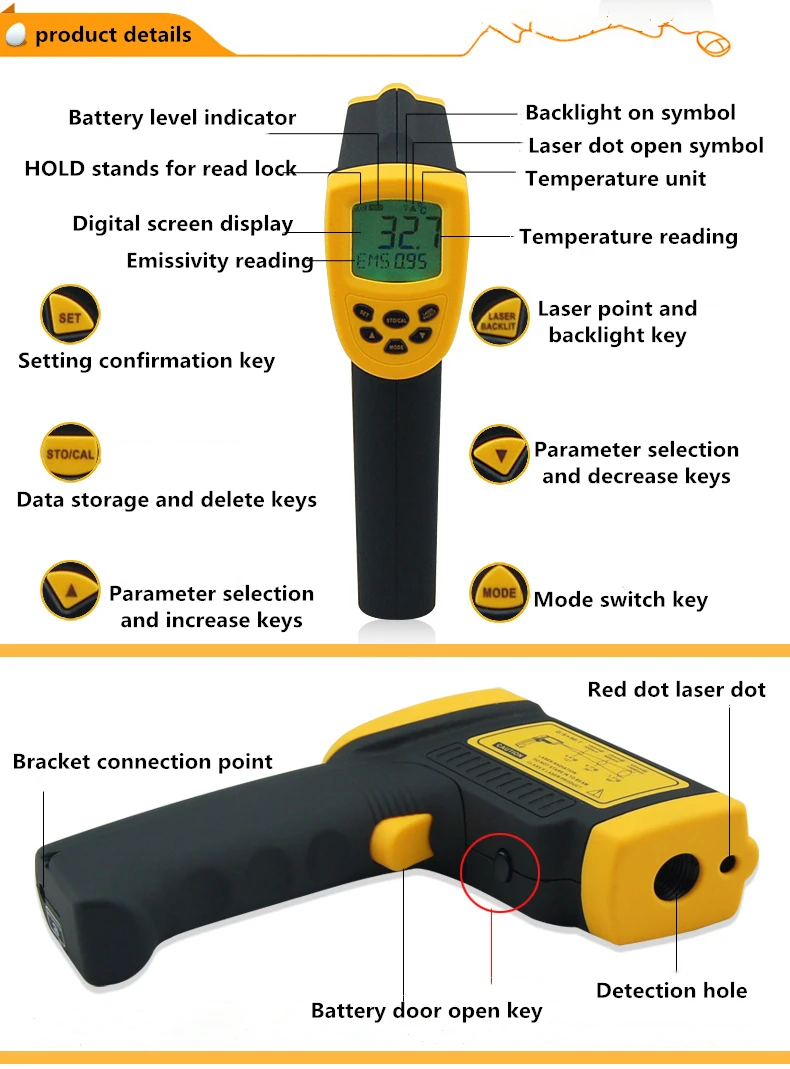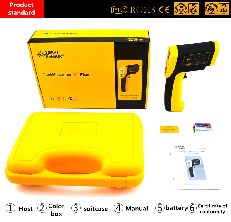Умный датчик AS872D + инфракрасный термометр компактный, прочный и простой в использовании. Просто наведите цель и нажмите кнопку, прочитайте текущие температуры поверхности менее чем за секунду. Безопасное измерение температуры поверхности горячих, опасных или труднодоступных объектов без контакта.
