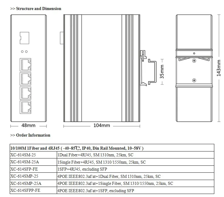 Input Voltage: DC10~58V (Redundant) Operating Temperature: -40℃ ~ +85℃ Case: IP40 protection, fan-less design Anti-static level: 8KV-15KV MTBF: 100000 Hours >> Description The Ethernet switch uses store-forward architecture,fan-less and energy-saving design.The design complies with the Ethernet standard with lightning and anti-static protection. They apply to the wide range of operating temperature from -40°C to +85°C with stable and reliable performance.They can be widely applied to various broadband data transmission fields, such as intelligent transportation, Telecommunications, security, financial securities, customs, shipping, power, water conservancy and oil fields.