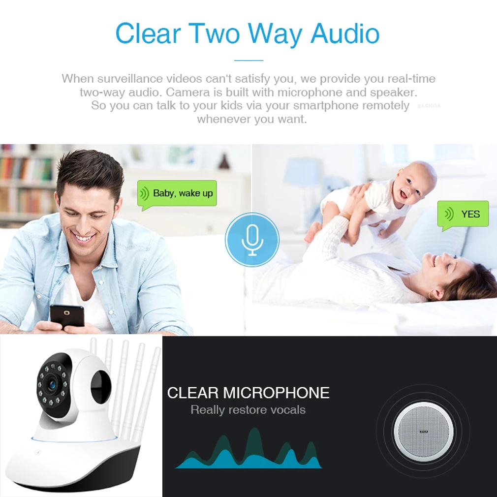 YUNSYE Wifi Ip камера безопасности-24/7 безопасность Плавный контроль панорамирования и наклона Головка камеры поворачивается с помощью панорамирования 350 ° и наклона 120 °, вы можете управлять им через приложение и получить широкий обзор. Четкое двустороннее аудио Камера оснащена встроенным микрофоном и динамиком, поэтому вы можете дистанционно разговаривать со своими детьми через смартфон, когда захотите. P2P возможность удаленного доступа в любом месте Благодаря удобной Технологии P2P, теперь вы можете просмотреть видеозапись в приложении V380Pro Обнаружение движения и запись сигнала тревоги Обнаружение движения прекрасно работает с сигналом сообщения приложения (без фото), убедившись, что вы всегда первый, чтобы получить информацию, когда все происходит. Поддержка просмотра нескольких пользователей Поддержка Android Iphone IOS смарт мобильный телефон, планшет, ноутбук использовать больше мониторинга в реальном времени терминал, поддержка 32 онлайн-посетителей simutaneoursly.