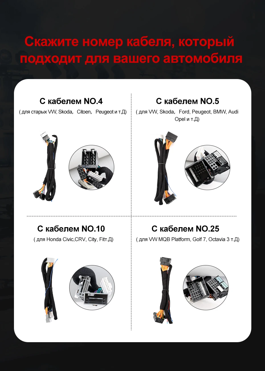 Пожалуйста, сообщите нам номер кабеля, который подходит для вашего автомобиля. Если вы не можете найти его на следующей фотографии, пожалуйста, покажите мне фотографию вашего автомобильного разъема, мы подтвердим это с вами.