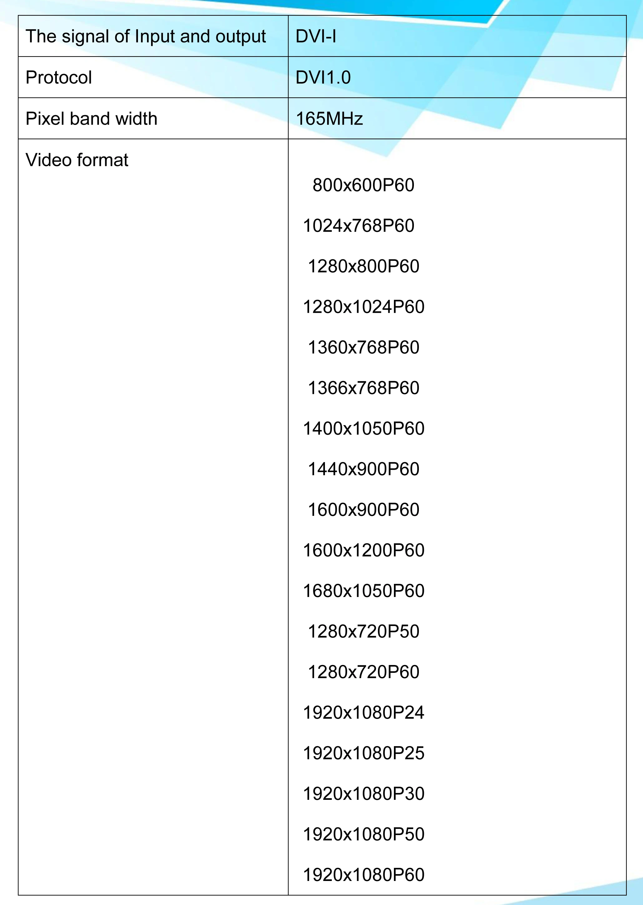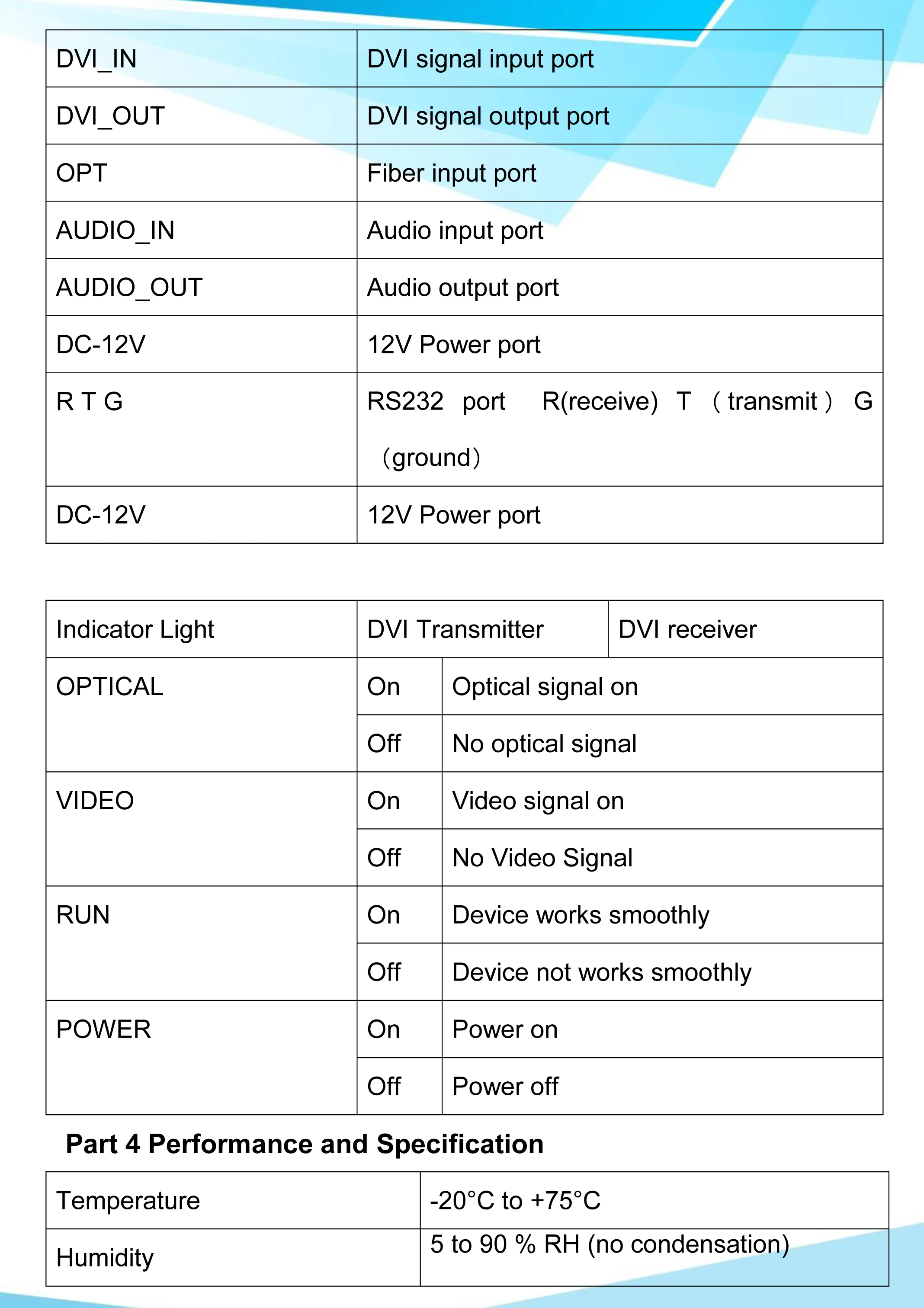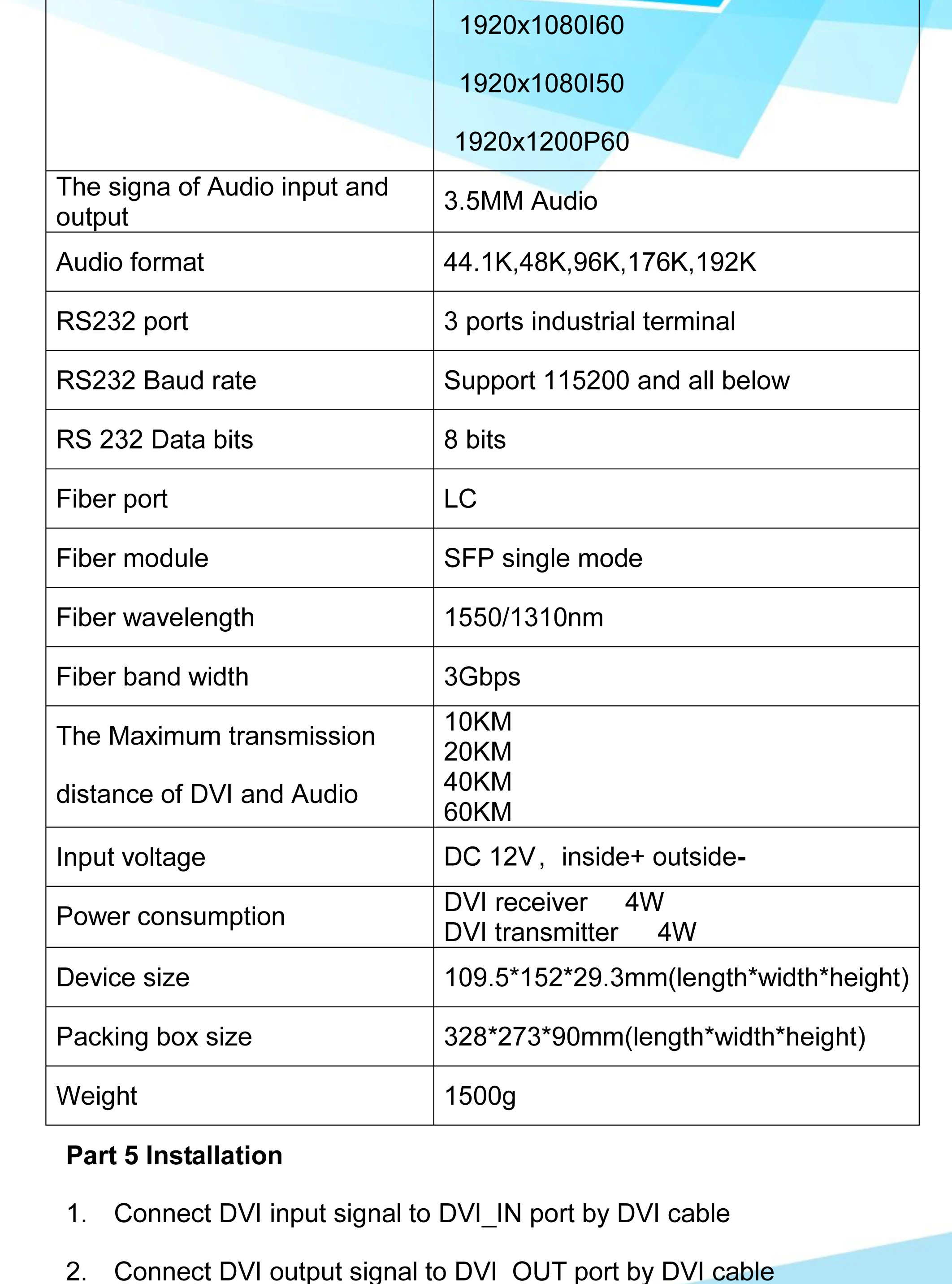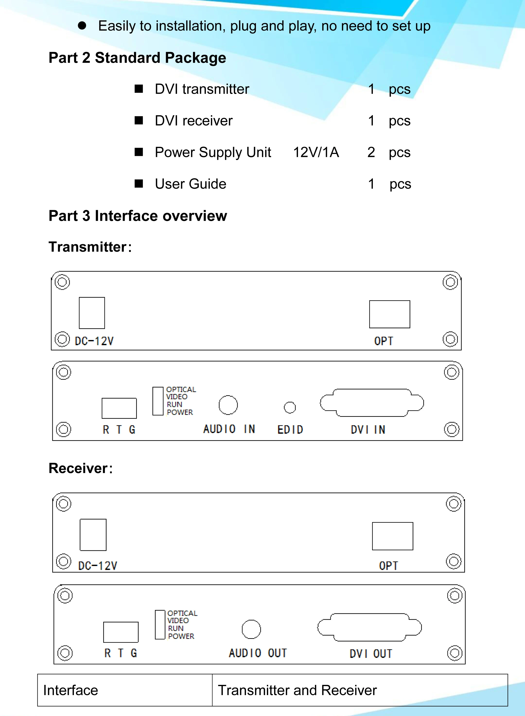 Часть 1 Обзор продукта Оптический передатчик и приемник DVI использует несжатое цифровое HD видео и высокоскоростную технологию передачи цифрового оптического волокна, он может передавать источник сигнала (источник компьютерного сигнала, DVI источник сигнала с высоким цифровым DVD/DVR) на дальние расстояния терминал легко, с сильной защитой от помех, обеспечить сигнал завершенным и стабильным Основные функции Оптическое волокно, полностью цифровое, без сжатия HD Поддержка видеосигнала Full HD 1920*1200 @ 60 Гц Увеличьте Затухание оптического модуля SFP от низкого до-3 дБ/км 1 канал аналоговый аудио (3,5 мм) Поддержка DVI 1,0 Protocal Поддержка KVM Автоматическая идентификация и настройка режима отображения Автоматическая выравнивание внутри, стабильная и Четкая графика. Безопасная защита от ОУР внутри, чтобы обеспечить повреждение от ОУР. Легко подключается к установке, подключается и воспроизводит, нет необходимости устанавливать Часть 2 Стандартный посылка Transmitter передатчик DVI 1 шт. Приемник DVI 1 шт. Питание блок 12V/1A комплект из 2 предметов Руководство пользователя 1 шт.