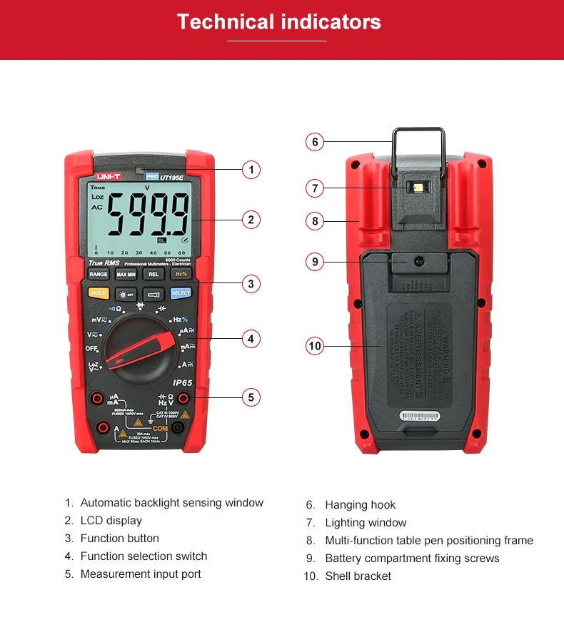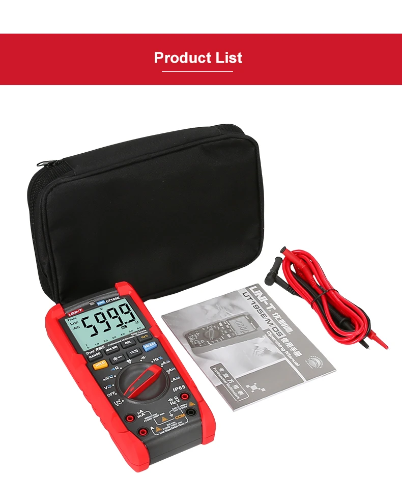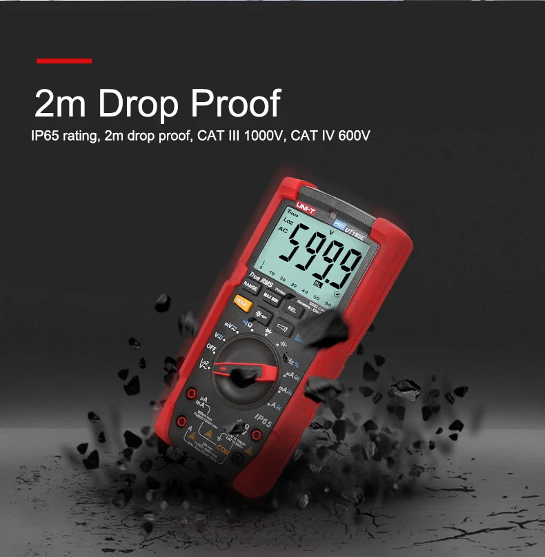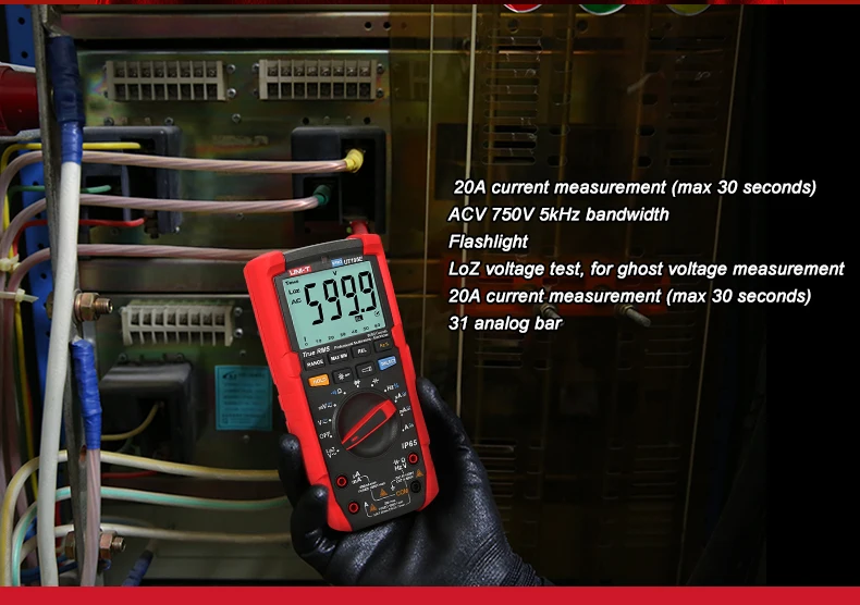 Особенности 1. Класс IP65, 2 м защита от падения, CAT III 1000 В, CAT IV 600 в 2. Большой 6000-Граф ЖК-экран 3. True RMS 4. ACV 750V 5kHz полоса пропускания 5. Фонарик 6. Автоматический ЖК-светильник, контролируемый датчиком на светильник (можно выключить) 7. LoZ тест напряжения, для измерения ghost напряжения 8. Измерение тока 20A (максимум 30 секунд) 9. 31 аналоговый бар