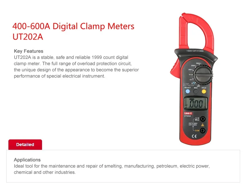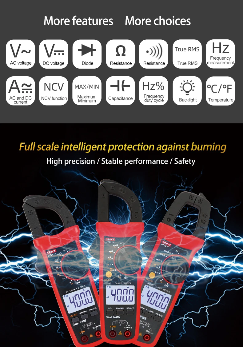 Сравнение модели UT202A + 600V AC DC измерение напряжения, 600A AC Измерение тока, Макс/мин/true RMS Функция: AC/DC напряжение, измерение переменного тока, диодный тест, сопротивление, непрерывный зуммер, фракция переменного тока, подсветка