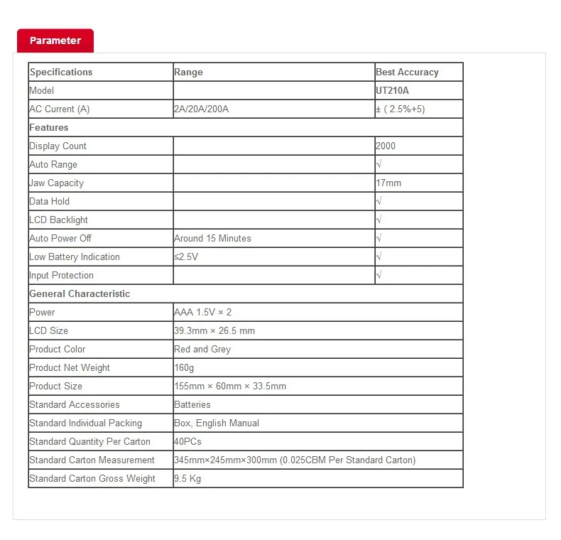 UT210 seriesMini Clamp Meters with the characteristics of high reliability, high security,automatic measurement range and miniaturization , which can accurately measure currentsignal;Product chip set up VFC startupmode,the inside will pass through aspecific filter circuit,filterthe high frequency interference signal to ensure the accuracy of themeasurement data.It issuitable for frequency conversion voltage, current with VFC,full range overload protection and unique appearance design,which becomes more superior performance of electrical instruments.It is suitable for school, smelt, communication,manufacturing, petroleum, national defense, electric power, chemical industryetc. It's an ideal tool for the maintenance and repair of the circuit , power equipment.