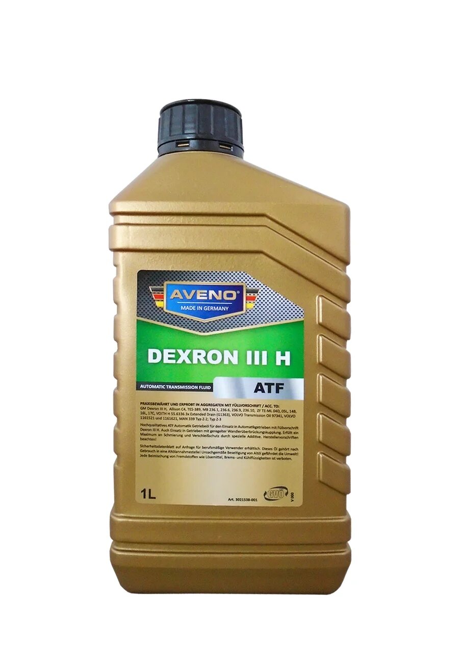 AVENO ATF DEXRON III H полусинтетическое трансмиссионное масло для автоматических коробок передач, разработанное на основе гидрокрекингового базового масла с добавлением ПАО и специального комплекса присадок и ингибиторов. AVENO ATF DEXRON III H Специально разработано для АКПП, где требуется применение трансмиссионного масла данной спецификации. Обеспечивает максимальное смазывание и защиту от износа, благодаря комплексу присадок. AVENO ATF DEXRON III H разработано для автоматических коробок переключения передач автомобилей последнего поколения с и без сцепления для блокирования гидротрансформатора(GKÜB = Getriebe-Kupplungs-Überbrückung), применяется для АКПП, где требуется применение жидкости спецификации Dexron III H. Область применения AVENO ATF DEXRON III H рекомендовано к применению, когда требуется использование трансмиссионной жидкости АТФ типа ATF Dexron III H. AVENO ATF DEXRON III H смешивается со всеми марками ATF. Перед заменой жидкости на AVENO ATF DEXRON III H рекомендуется сделать промывку. Придерживайтесь рекомендациям производителя техники и двигателя. Спецификации AVENO ATF DEXRON III H соответствует требованиям и спецификациям: GM Dexron III H Allison C4, TES-389 MB 236.1, 236.6, 236.9, 236.10 ZF TE-ML 04D, 05L, 14B, 16L, 17C VOITH H 55.6336.3x Extended Drain (G1363) VOLVO Transmission Oil 97341, VOLVO 1161521 und 1161621 MAN 339 Typ Z-2, Typ Z-3 Свойства AVENO ATF DEXRON III H обеспечивает: Прекрасную защиту от износа, шламообразования, залипания и коррозии Высокий и стабильный индекс вязкости Эксплуатация при низких температурах Низкую температуру застывания Очень хорошую устойчивость к окислению Хорошие свойства трения Нейтральность по отношению к уплотнительным материалам Благодаря ингибиторов нейтральность по отношению к цветным металлам