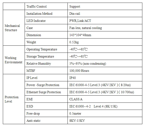 Входное напряжение: 10 ~ 58 В постоянного тока (резервное) Рабочая температура: -40 ℃ ~ + 85 ℃ Чехол: защита IP40, конструкция без вентилятора Антистатический уровень: 8кв-15кв MTBF: 100000 часов > Описание Коммутатор Ethernet использует архитектуру store-forward, безвентиляторную и энергосберегающую конструкцию. Конструкция соответствует стандарту Ethernet с молнией и антистатической защитой. Они применимы к широкому диапазону рабочей температуры от-30 °C до + 75 °C с стабильной и надежной производительностью. Они могут широко применяться в различных областях широкополосной передачи данных, таких как интеллектуальная транспортировка, телекоммуникации, безопасность, финансовые ценные бумаги, таможня, транспортировка, энергетика, водоснабжение и нефтяные месторождения.