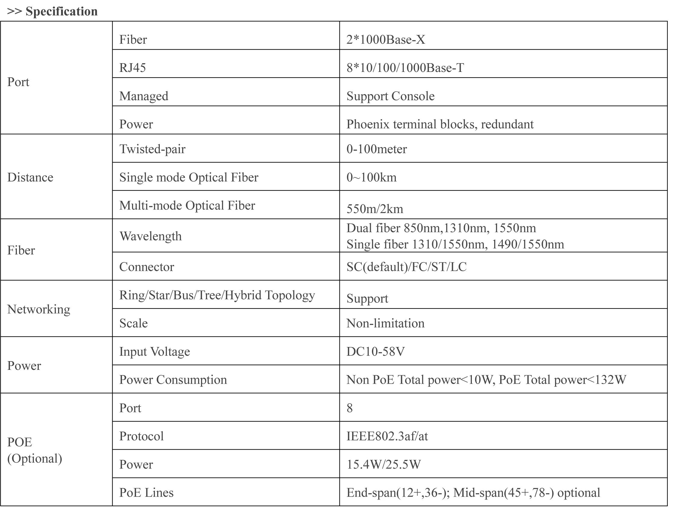 Входное напряжение: 10 ~ 58 В постоянного тока (с резервированием) Рабочая температура: -40 ℃ ~ + 85 ℃ Чехол: защита IP40, дизайн без вентилятора Антистатический уровень: 8 кв-15 кв MTBF: 100000 часов > Описание Коммутатор Ethernet использует архитектуру store-forward, безвентиляторную и энергосберегающую конструкцию. Конструкция соответствует стандарту Ethernet с молнией и антистатической защитой. Они применяются в широком диапазоне рабочих температур от-40 °C до + 85 °C с стабильной и надежной производительностью. Они могут широко применяться в различных областях широкополосной передачи данных, таких как интеллектуальный транспорт, телекоммуникации, безопасность, финансовые ценные бумаги, таможня, доставка, электроэнергия, Охрана воды и нефтяные месторождения.
