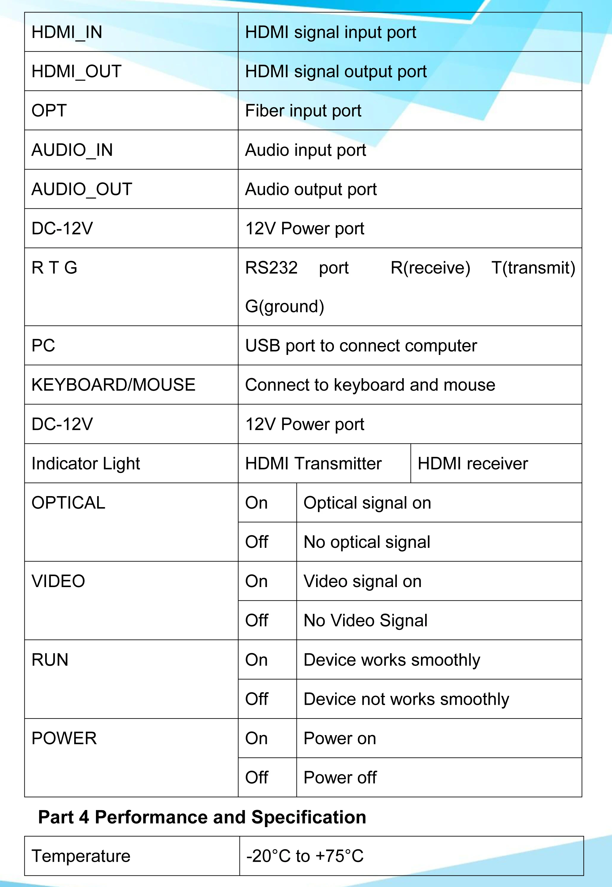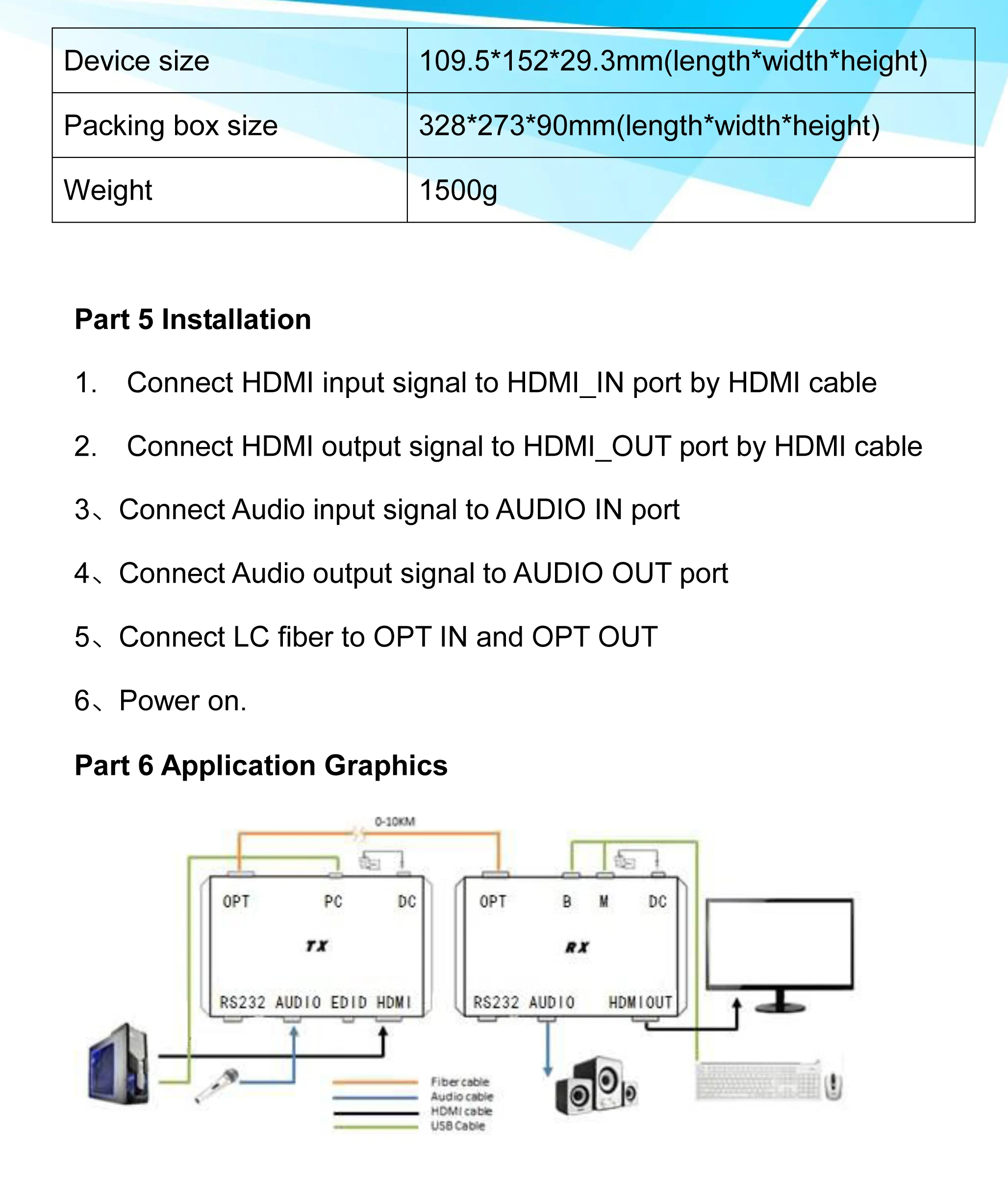 Часть 1 Обзор продукта Оптический передатчик и приемник HDMI использует несжатое цифровое HD видео и высокоскоростную технологию передачи цифрового оптического волокна, он может передавать источник сигнала (источник компьютерного сигнала, VGA источник сигнала с высоким цифровым DVD/DVR) на дальние расстояния терминал легко, с сильной защитой от помех, обеспечить сигнал завершенный и стабильный Основные функции Оптическое волокно, полностью цифровое, без сжатия HD Поддержка видеосигнала Full HD 1920*1200 @ 60 Гц Увеличьте Затухание оптического модуля SFP до-3 дБ 1 канал аналоговый аудио (3,5 мм) Поддерживающий протокол HDMI 1.3b Поддержка KVM Автоматическая идентификация и настройка режима отображения Автоматическая выравнивание внутри, стабильная и Четкая графика. Безопасная защита от ОУР внутри, чтобы обеспечить повреждение от ОУР. Легко подключается к установке, подключается и воспроизводит, нет необходимости устанавливать