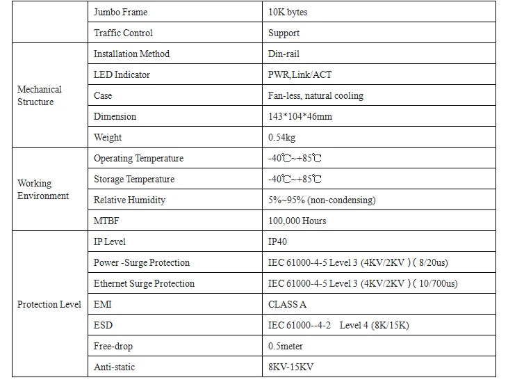 Входное напряжение: 10 ~ 58 В постоянного тока (с резервированием) Рабочая температура: -30 ℃ ~ + 75 ℃ Чехол: защита IP40, дизайн без вентилятора Антистатический уровень: 8 кв-15 кв MTBF: 100000 часов > Описание Коммутатор Ethernet использует архитектуру store-forward, безвентиляторную и энергосберегающую конструкцию. Конструкция соответствует стандарту Ethernet с молнией и антистатической защитой. Они применяются в широком диапазоне рабочих температур от-30 °C до + 75 °C с стабильной и надежной производительностью. Они могут широко применяться в различных областях широкополосной передачи данных, таких как интеллектуальный транспорт, телекоммуникации, безопасность, финансовые ценные бумаги, таможня, доставка, электроэнергия, Охрана воды и нефтяные месторождения.