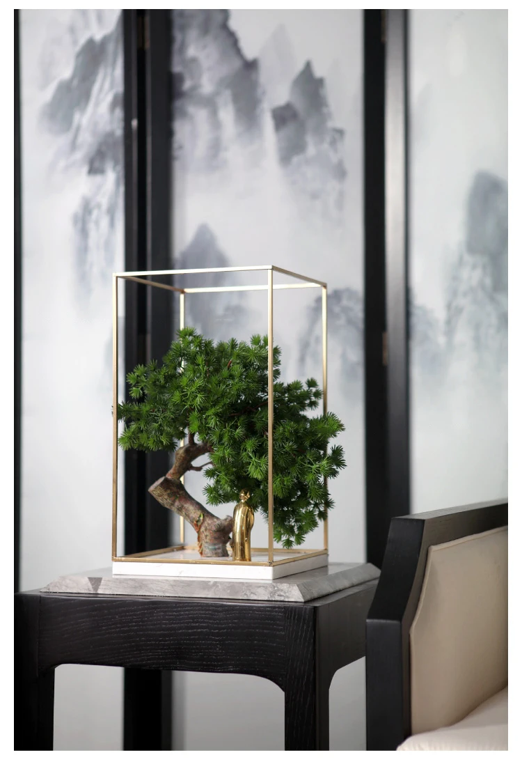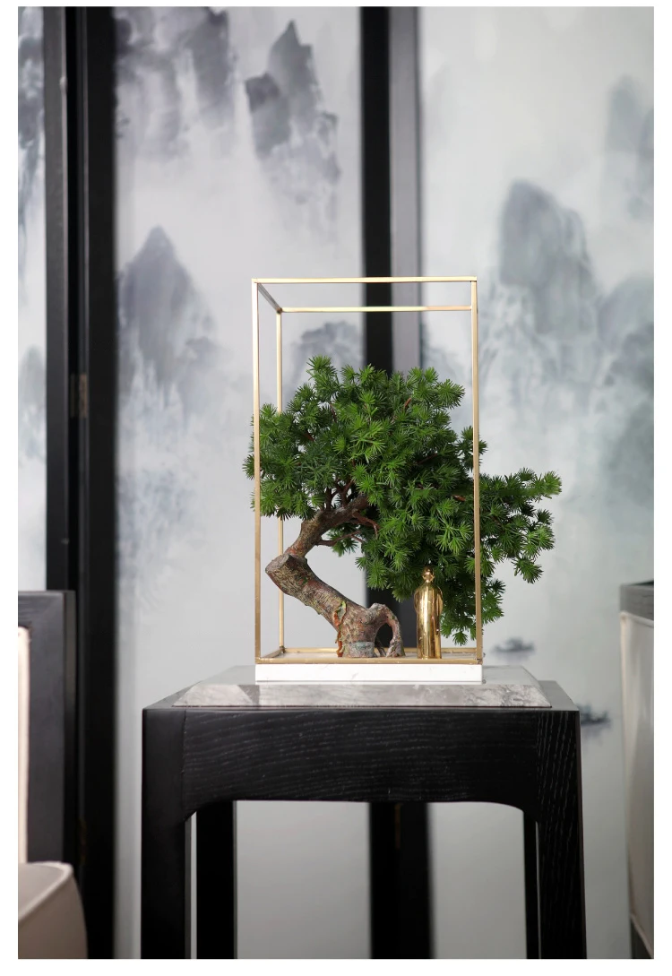 Имитация растений бонсай с золотой металлической оправой, Современная латунная подставка с персонажами под деревом баньян, украшения для отеля Декор для дома комнаты