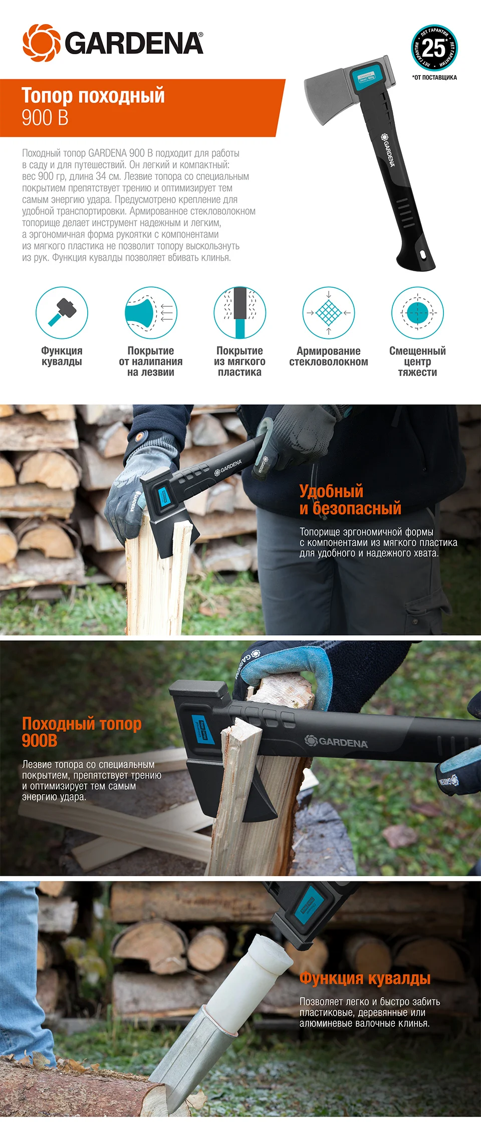Походный топор GARDENA 900В идеально подойдет для работы в саду и для путешествия. Лезвие топора со специальным покрытием, препятствует трению и оптимизирует тем самым энергию удара. Армированное стекловолокном топорище делает его надежным и легким.