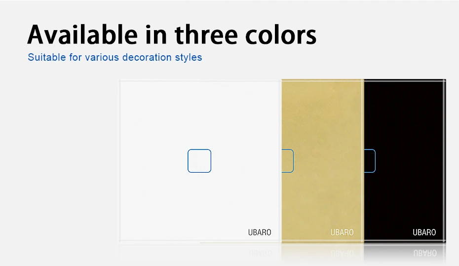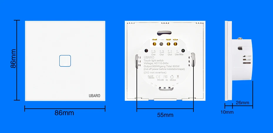 1. Название бренда: UBARO 2. Кнопка: 1 банда, 2 банды, 3 банды на выбор 3. Цвет: черный, белый, золотой 4. Размер: 8,6*8,6*3,5 см/3,4*3,4*1,4 "(Д * Ш * В) 5. Ток: 10A 6. Ватт: 3-300 Вт/комплект 7. Рабочее напряжение: 170-240 В переменного тока 8. Рабочая температура: -20 ℃ ~ + 70 ℃ 9. Относительная влажность: 10% ~ 90% 10. Механический срок службы: 100000 раз 11. Сертификация: CE,CCC ,ROHS 12. Гарантия: 1 год 13. Время доставки: <3 дня получили ваш заказ 14, вес брутто: 0,15 кг/5,25 oz Вес нетто: 0,14 кг/4,9 oz 15. Размеры посылка: 9,0*9.0x4.0 см/3,5x3,5x1,55 (Д * Ш * В)