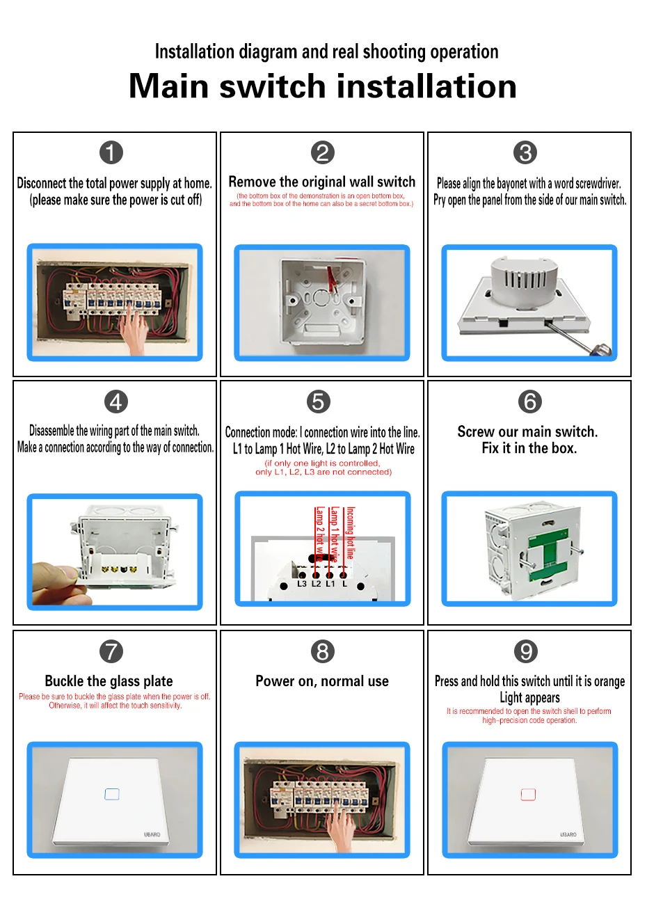 1. Во время процесса установки, вы должны отрезать источник питания. 2. Конструкция с одним пожарным проводом, нет необходимости открывать стену для перемотки, непосредственно заменяет старый переключатель.
