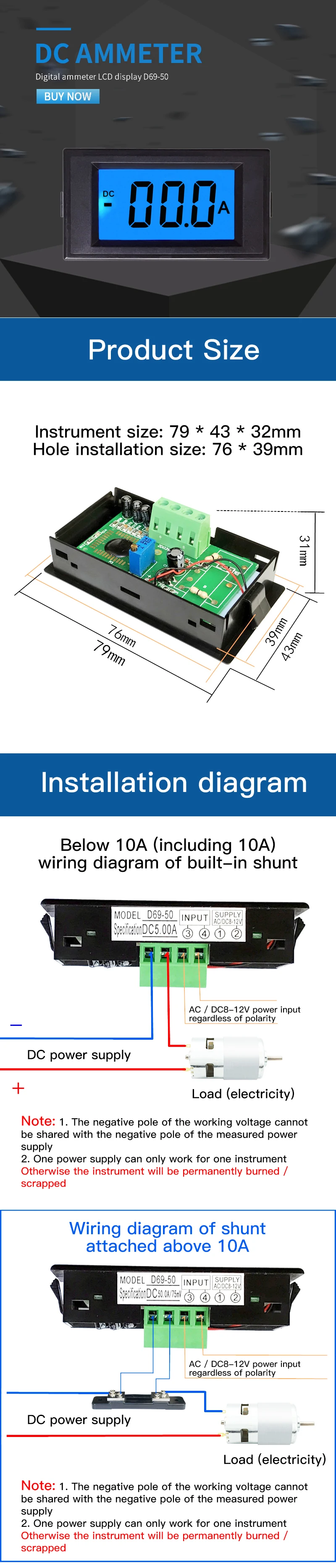 Совершенно новый и высокое качество. Источник питания: AC/DC8-12V, тонкий красный провод: +, тонкий черный провод: - . Может работать на 9 в 12 В 24 В. Источник питания имеет защиту от обратной полярности. Диапазон: 0,00 ~ 500A, отображение 2 цифр после запятой. Толстый белый провод должен подключаться к отрицательному электроду нагрузки, толстый черный провод должен подключаться к отрицательному электроду источника питания. Примечание: 2 толстых провода не должны соединять положительный электрод, в противном случае счетчик выгорит! Частота обновления: около 500 мс/раз. Точность: 1%(+/- 1 цифра) Рабочая температура: -10 °C ~ 65 °C. .