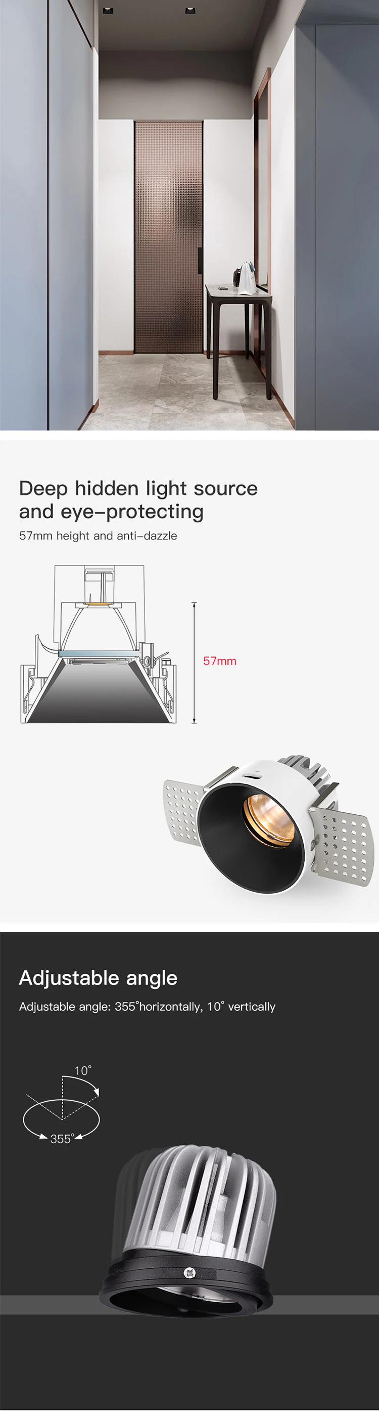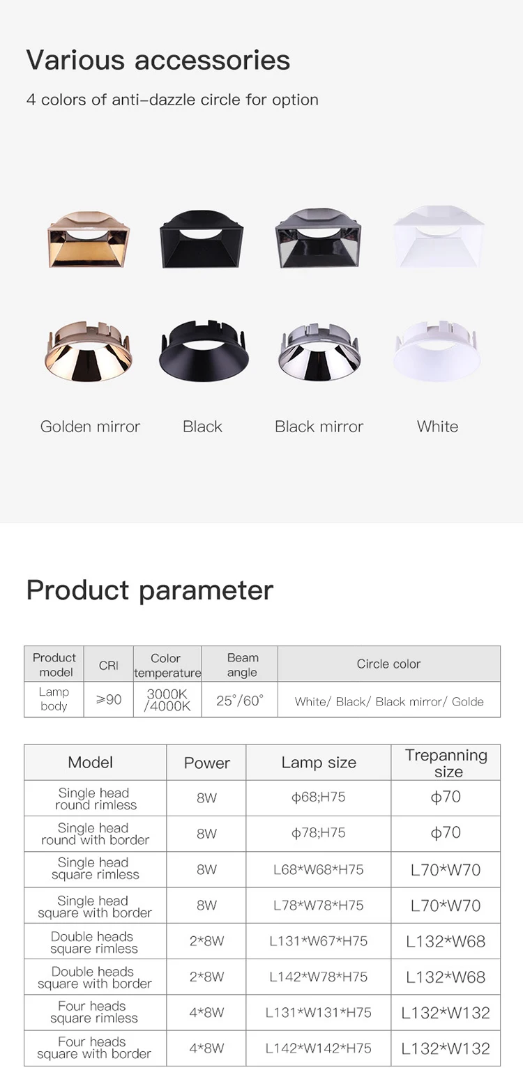 Бренд: MR. XRZ Материал: Алюминий die-cast Цвет тела: белый Круг против ослепления: Черное, Белое, Черное Зеркало, Золотое Зеркало Тип источника света: LED CRI (Индекс цветоодеринга (Ra>90) близко к ежедневному зрению, которое защищает глаз и больше подходит для чтения) Чипсы бренд: LUMINUS чипсы Водитель: DIMTRONIC Мощность: 8 Вт 2'8W 4'8W Светящийся поток: 60lm/W Угол луча: 25 градусов, 60 дегресс Цветовая температура: Теплый белый (3000K), Натуральный белый (4000K) Гарантийный срок: 2 года Продолжительность жизни: 25 000 часов