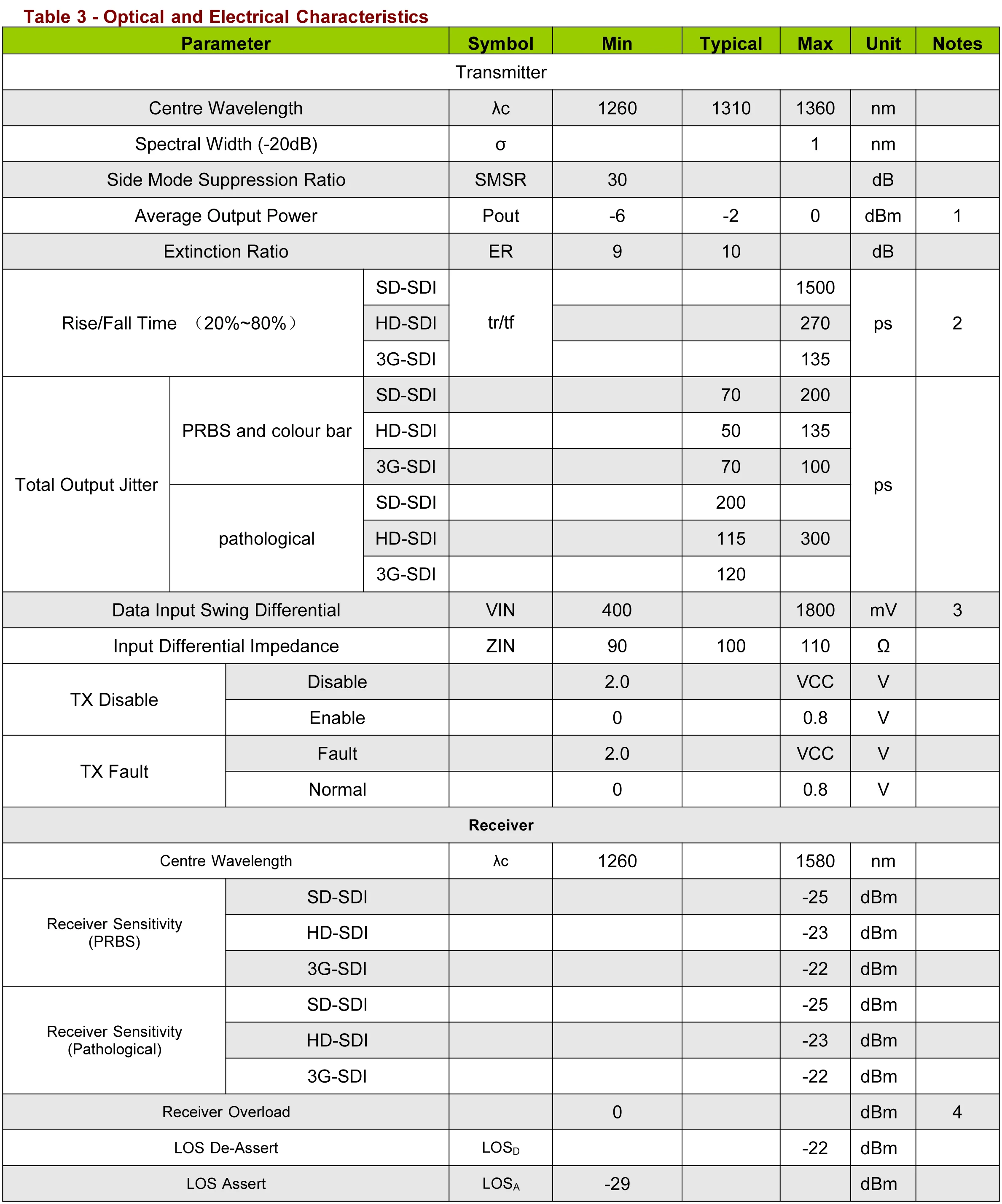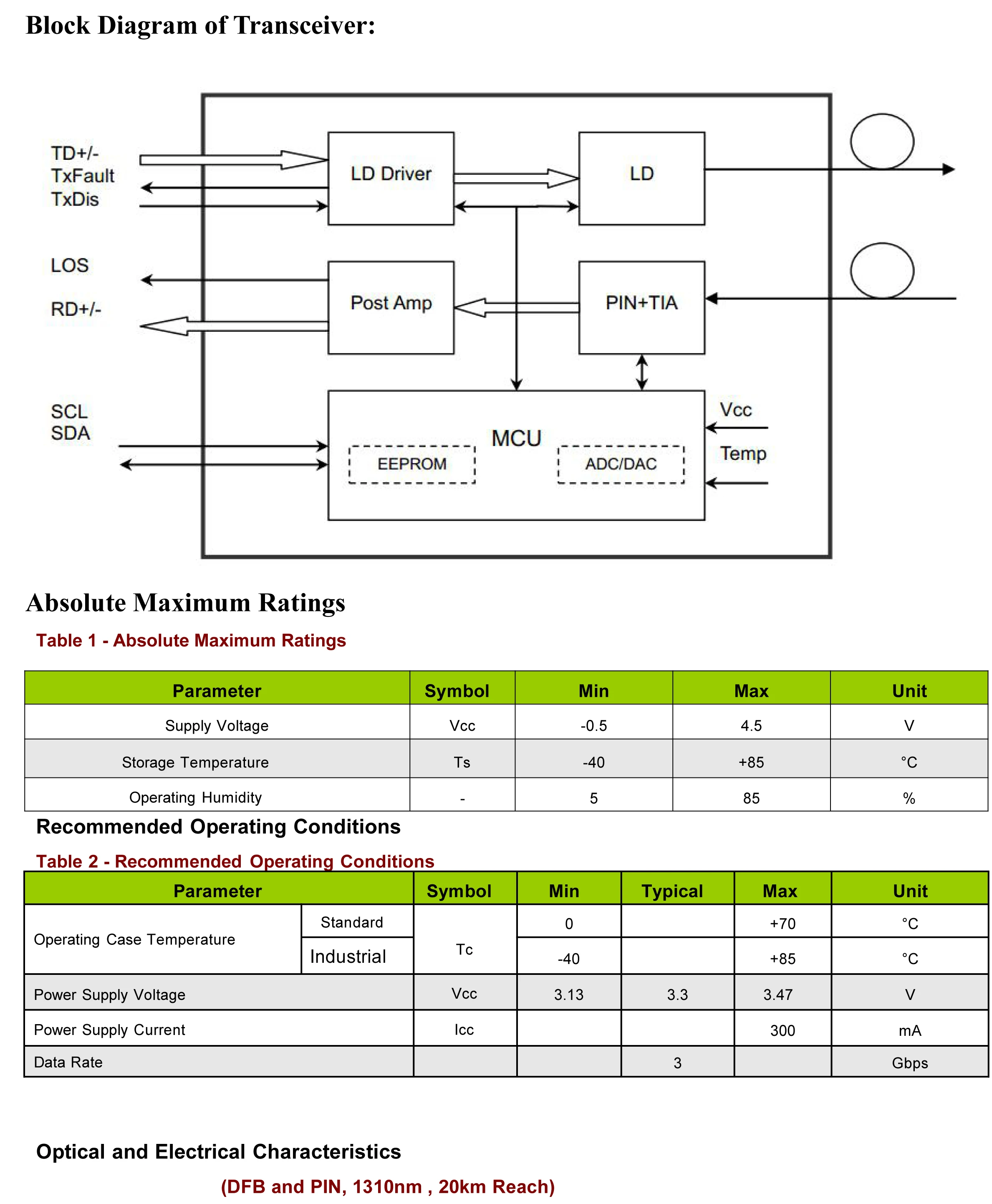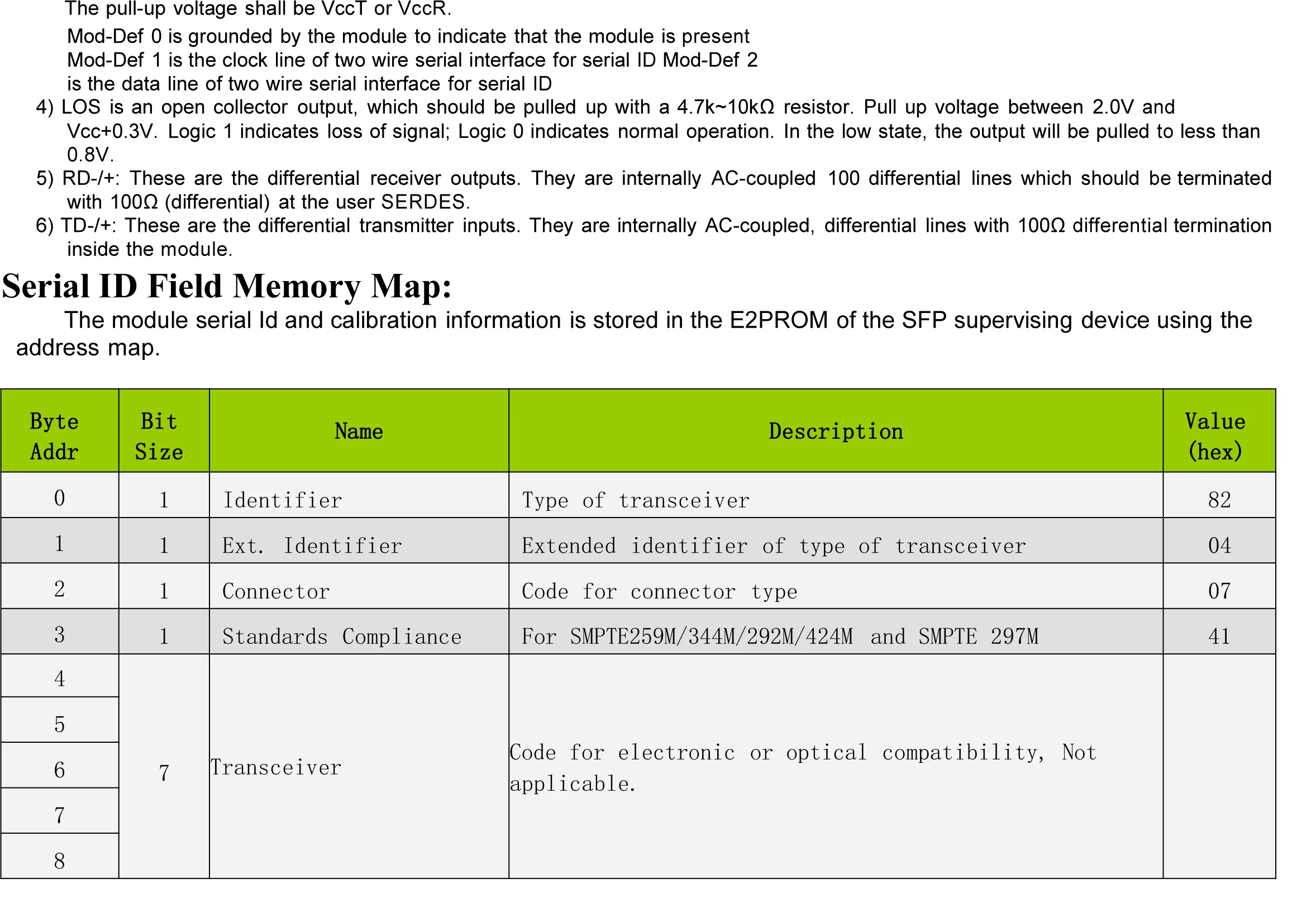 Особенности: Приемопередатчик SFP HD-SDI в наличии Приемопередатчик SFP SD-SDI в наличии Доступный трансивер SFP 3G-SDI Совместимо с SMPTE 297-2006. Металлический корпус для нижних EMI DFB 1310nm DFB лазерный и контактный фотодетектор SDI поддерживает видео патологические узоры для SD-SDI, HD-SDI и 3G-SDI Совместимо с SFP MSA и SFF-8472 с дуплексным разъемом LC Портативные функции цифровой диагностики, доступные через интерфейс I2C Доступно по ограничению на использование опасных материалов в производстве + 3,3 в один источника питания Термостойкий рабочий чехол: Стандарт: от 0 до + 70 °C Промышленный: от-40 до + 85 °C Область применения: Совместимые электрические-оптические интерфейсы SMPTE 297-2006. Поддерживаемые интерфейсы службы HDTV/SDTV. Описание: Приемопередатчики серии видео Высокая производительность, экономически эффективные модули для простого видео Применение передачи через одномодовое волокно. Приемопередатчик предназначен для передачи/приема данных от 50 Мбит/с до 2,97 Гбит/с и специально разработан для надежной производительности при наличии патологических шаблонов SDI для SMPTE 259M, SMPTE 344M, SMPTE 292M и SMPTE 424M серийные скорости. Модуль полностью совместим с SMPTE 297M-2006. Трансивер состоит из трех секций: DFB лазерный передатчик, контактный фотодиодный интегрированный с трансимпедансным преусилителем (TIA) и MCU блоком управления. Все модули удовлетворяют требованиям лазерной безопасности класса I. Приемопередатчики совместимы с мульти-исходным соглашением SFP (MSA) и SFF-8472. Для получения дополнительной информации, пожалуйста, обратитесь к SFP MSA.