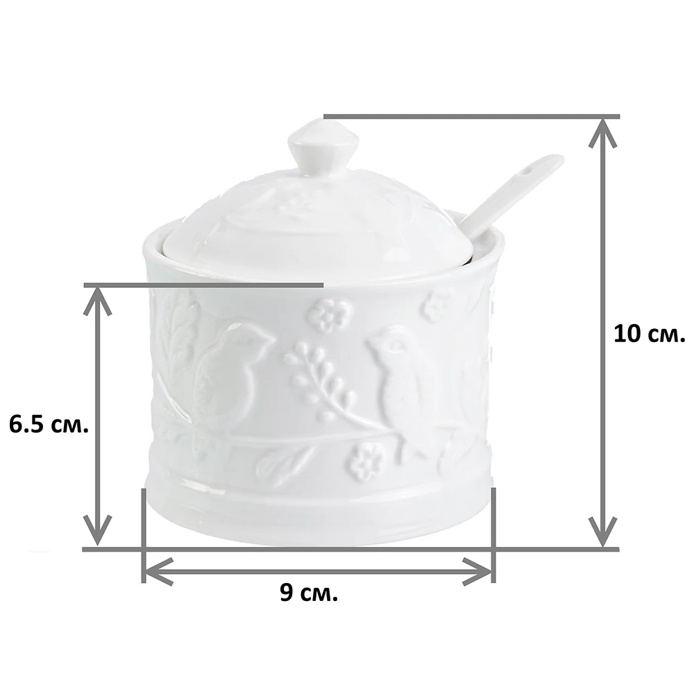 Сахарница из серии «Птички на ветке» объемом 270 мл с фарфоровой крышкой и ложкой выполнена из высококачественного фарфора. Изящный рельефный рисунок на фарфоре и удобство использования делают эту сахарницу желанным подарком любой хозяйке. У сахарницы широкое горло, которое удобно мыть, а крышка не позволит сахару намокнуть. В серии посуды из белого фарфора представлен широкий ассортимент товаров для сервировки стола, которые, несомненно, впишутся в любой интерьер благодаря лаконичному дизайну, натуральным материалам и высокой функциональности. Такому подарку будет рада любая хозяйка!