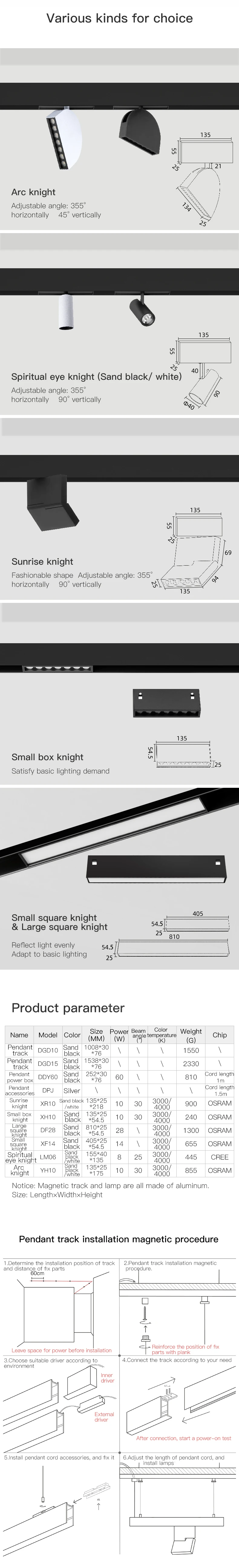Установка трех видов магнитного трека Подвеска/поверхность/утопленная установлена для опции, удовлетворяющей различные высоты и требования этажей. Утопленный трек: Rimless дизайн, видя свет, не видя лампы Поверхностный трек: Применить то, что вы хотите, легко исправить трек огни и лампы. Подвеска трек: изящный и классический дизайн люстры.
