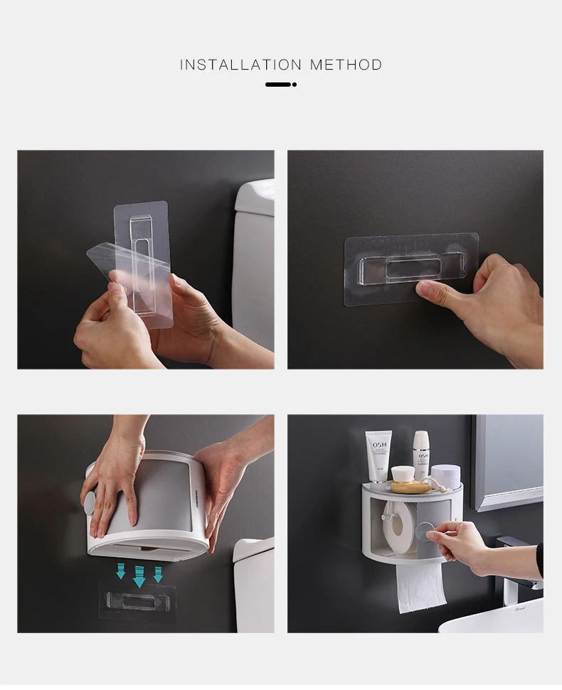 2. Powerful мощная самоклеящаяся клейкая подложка, сильная адгезия и защита от воды, обеспечивают дополнительную прочность и долговечность. Он может переносить вес более 8-10 кг. И этот самоклеящийся держатель для туалетного рулона прост в установке и не требует просверливания отверстий в стенах, наклеивания на стену, дверь, стекло и керамика.