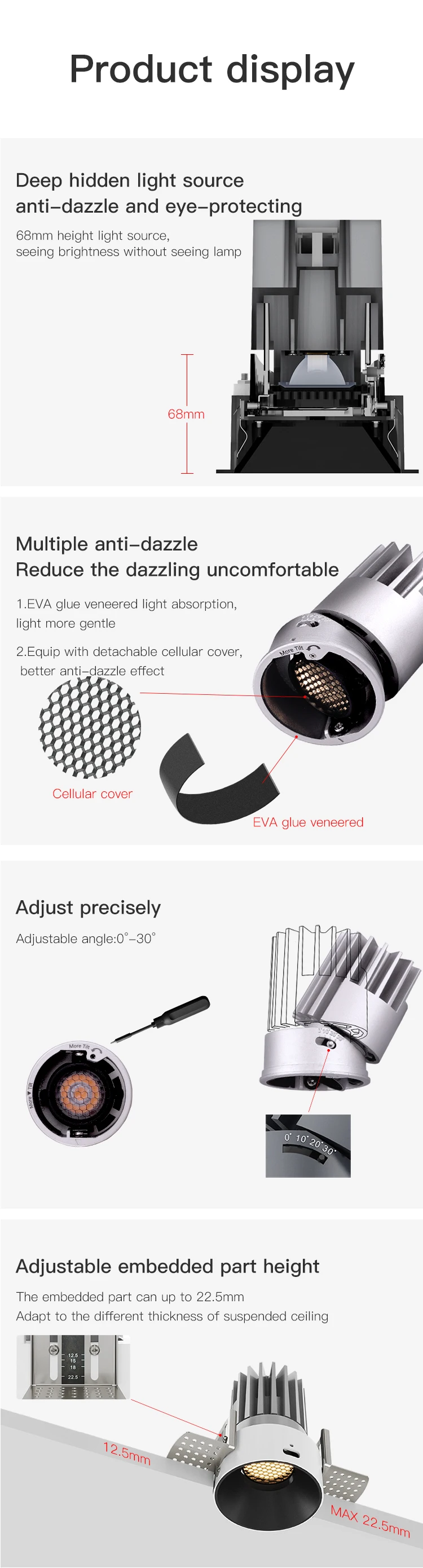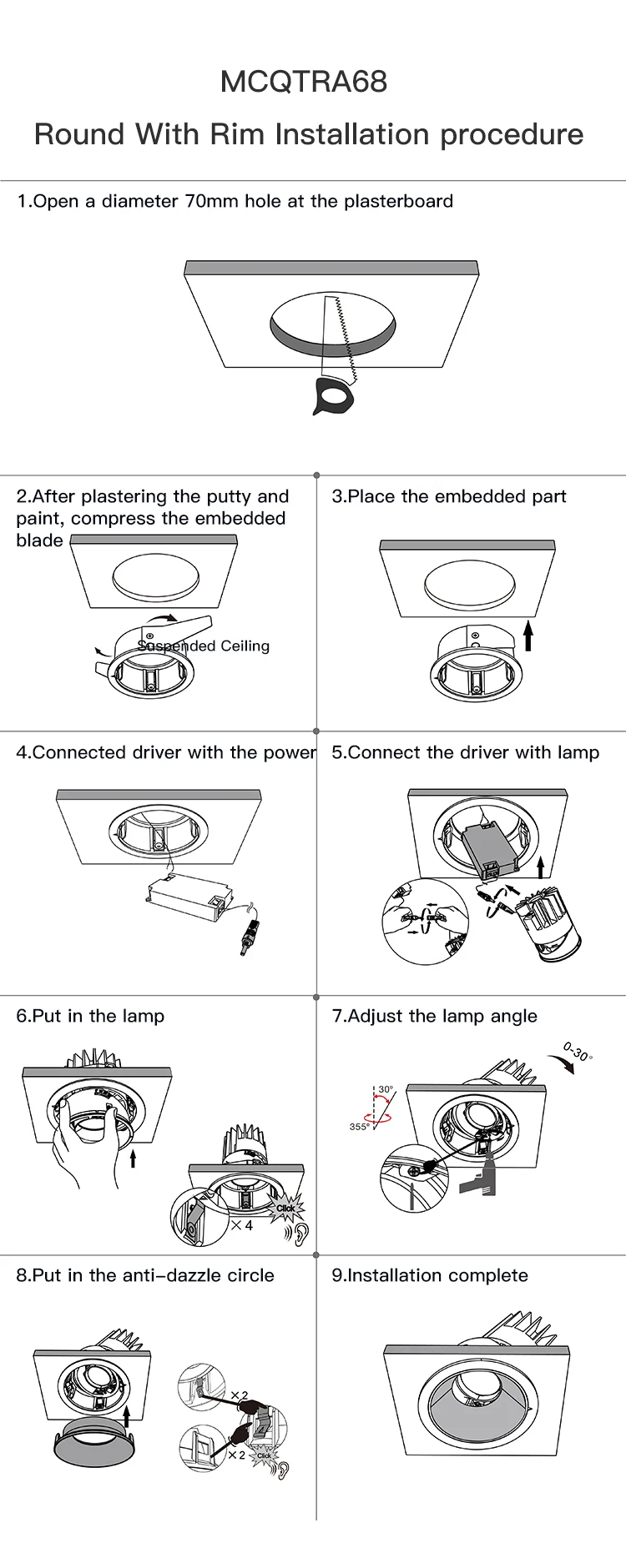 Откройте 70 мм диаметр отверстия, нож красные части 1.Trenpanning, место встроенных частей 2.Исправлено встроенные части 3.Используйте суставную лигатуру, заполнив интерстис, штукатурив шпришку на поверхности 4.Подключенная мощность 5.Положите в лампу 6.Отрегулируйте высоту лампы 7.Положите в анти-ослепительный круг 8.Установка завершена