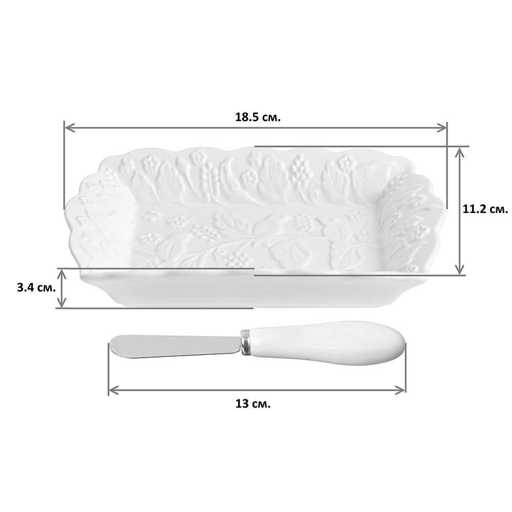 Тарелка под масло серии "Птички на ветке" с ножом выполнена из высококачественного фарфора с рельефным рисунком. Тарелка очень изящно смотрится на столе и добавит изысканности любой сервировке. В серии посуды из белого фарфора представлен широкий ассортимент товаров для сервировки стола, которые, несомненно, впишутся в любой интерьер благодаря лаконичному дизайну, натуральным материалам и высокой функциональности. Такому подарку будет рада любая хозяйка!