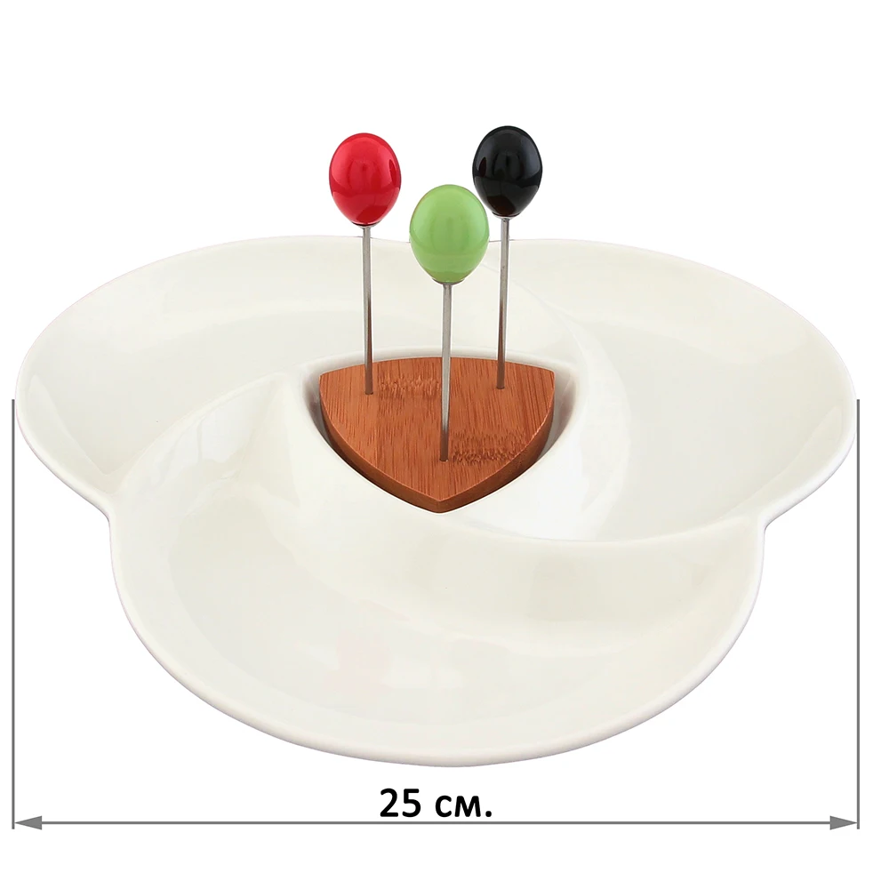 Менажница «Айсберг» выполнена из высококачественного фарфора с 3-мя секциями и 3-мя шпажками. Менажница прекрасно подходит для сервировки орешков, закусок, оливок, сладостей и благодаря необычному дизайну украсит любой стол. В серии фарфоровой посуды с использованием бамбука представлен широкий ассортимент товаров для сервировки стола, которые, несомненно, впишутся в любой интерьер благодаря лаконичному дизайну, натуральным материалам и высокой функциональности. Такому подарку будет рада любая хозяйка!