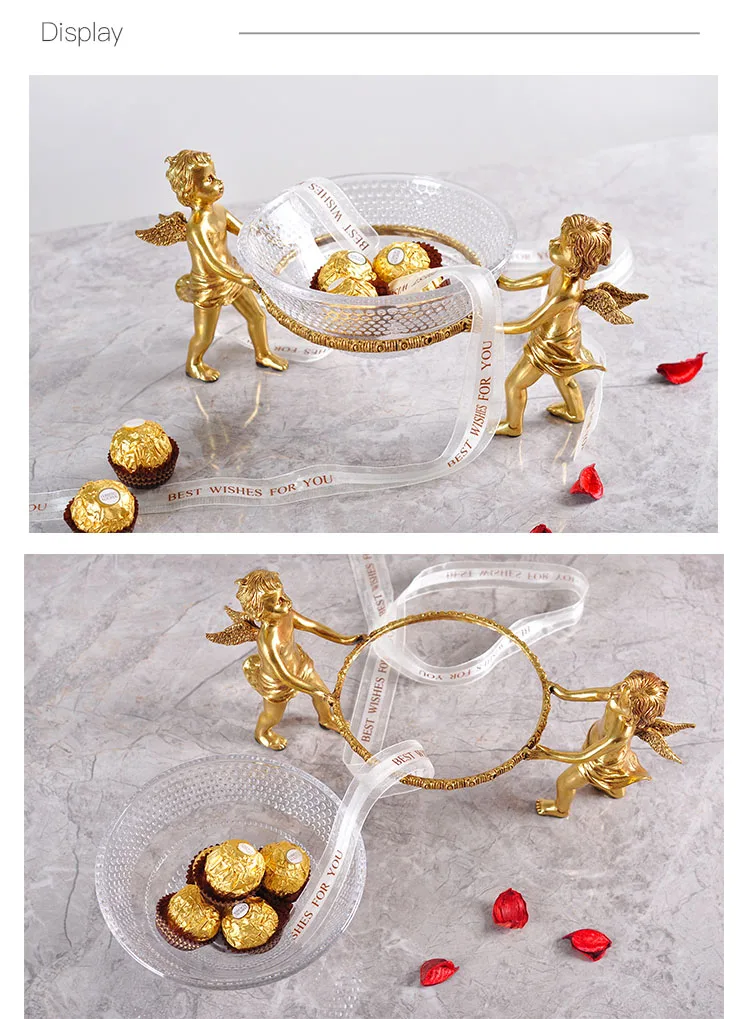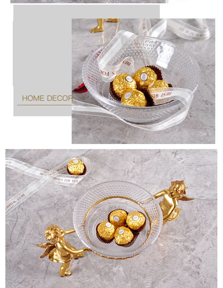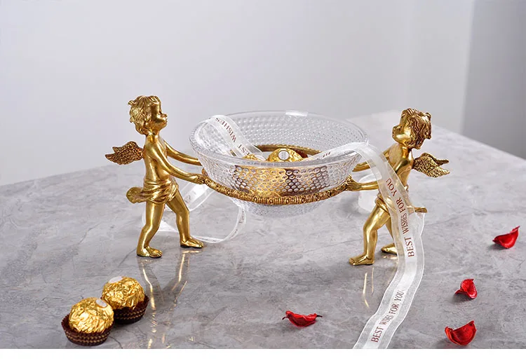 Роскошная золотая латунная посуда для мальчиков с двумя ангелами и эльфом, домашняя стеклянная Фруктовая тарелка, декор для гостиной, фруктовая тарелка, миска для конфет