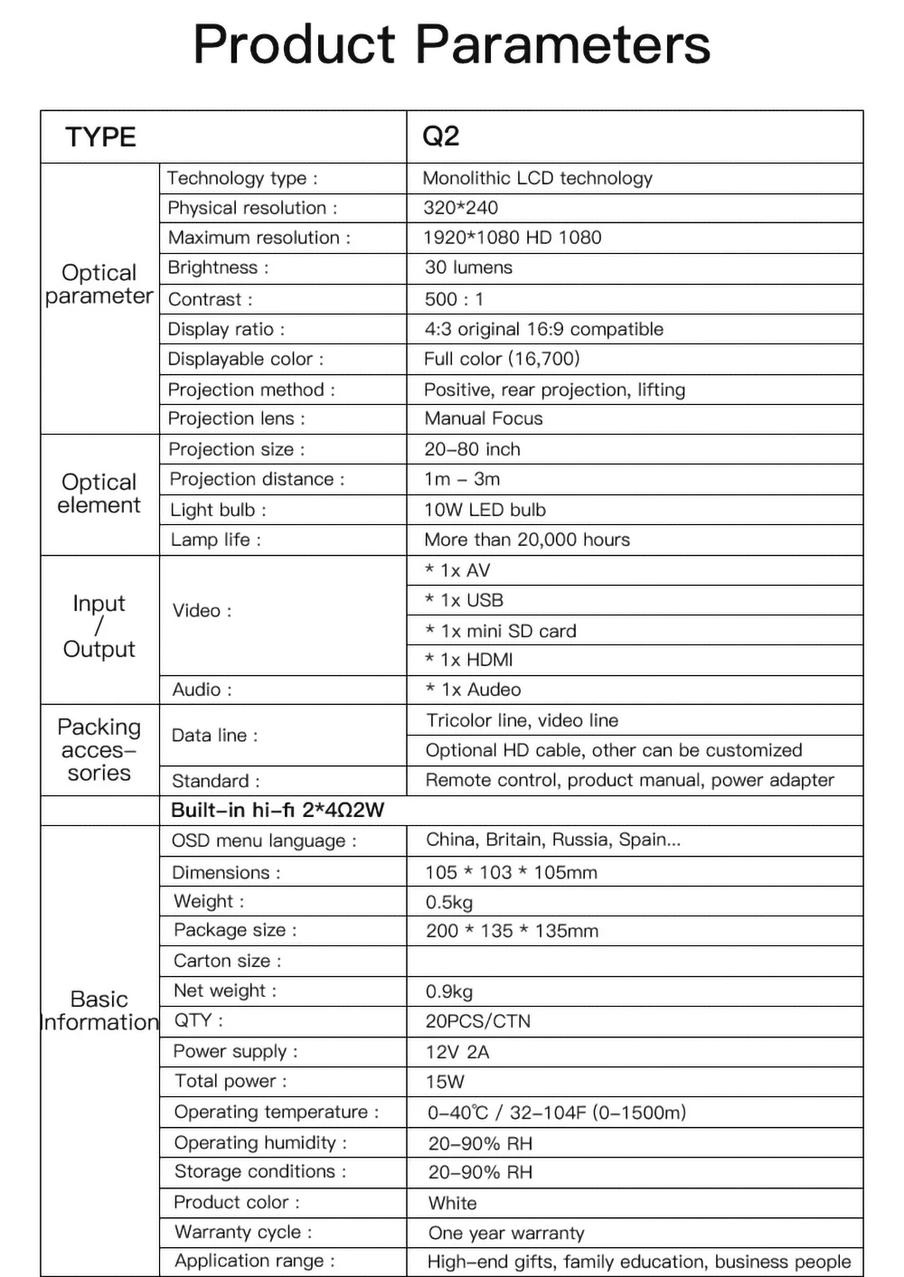 Модель: Q2 Тип дисплея: ЖК-дисплей Родное разрешение: 320x240 Разрешение поддержки: 1920x1080 Яркость: 700 люмен Контрастность: 800: 1 Отношение проекции: 1,4: 1 Проекционное расстояние: 0,8-3 м Размер изображения: 24-80 дюймов Масштаб экрана: 4: 3 Интерфейс: HDMI, USB, TF слот для карты Сертификат: CE, ROHS, FCC Лампа: светодиодный светильник Bluetooth: Unsupport Форматы изображений: Bmp, png, jpeg Форматы видео: Mp4, rmvb, avi, rm, mkv и т. Д. Аудио форматы: Mp3, wma, ogg, aac, flac, ape, wav Вход адаптера переменного тока: 100-240 В 50/60 Гц 2.0a Источник питания: 12V-2.0A Встроенный динамик: Да Шум (дБ): 24 Совместимость с: Sony PS4, Xbox Срок службы лампы: 30000 часов Поддержка DVB-T: нет Внешняя Подпись поддерживается: нет 3D: нет Высота штатива: не входит в комплект Вес продукта: 0,5 кг Посылка Вес: 0,8 кг Размер продукта (Ш x В): 10,30x10,50x11,00 см Посылка Размеры Размер упаковки (Д x Ш x В): 20,00x13,50x13,50 см Посылка содержит: Хост-проектор Q2 + адаптер питания + пульт дистанционного управления + av-линия «Три в одном» + руководство на английском языке