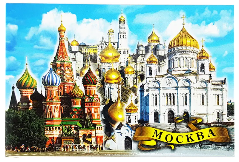 Храм Василия Блаженного, золотые купола церквей Кремля, Храм Христа Спасителя на фоне голубого неба - это память которую легко сохранить, если купить магнит коллаж изготовленный из металла.